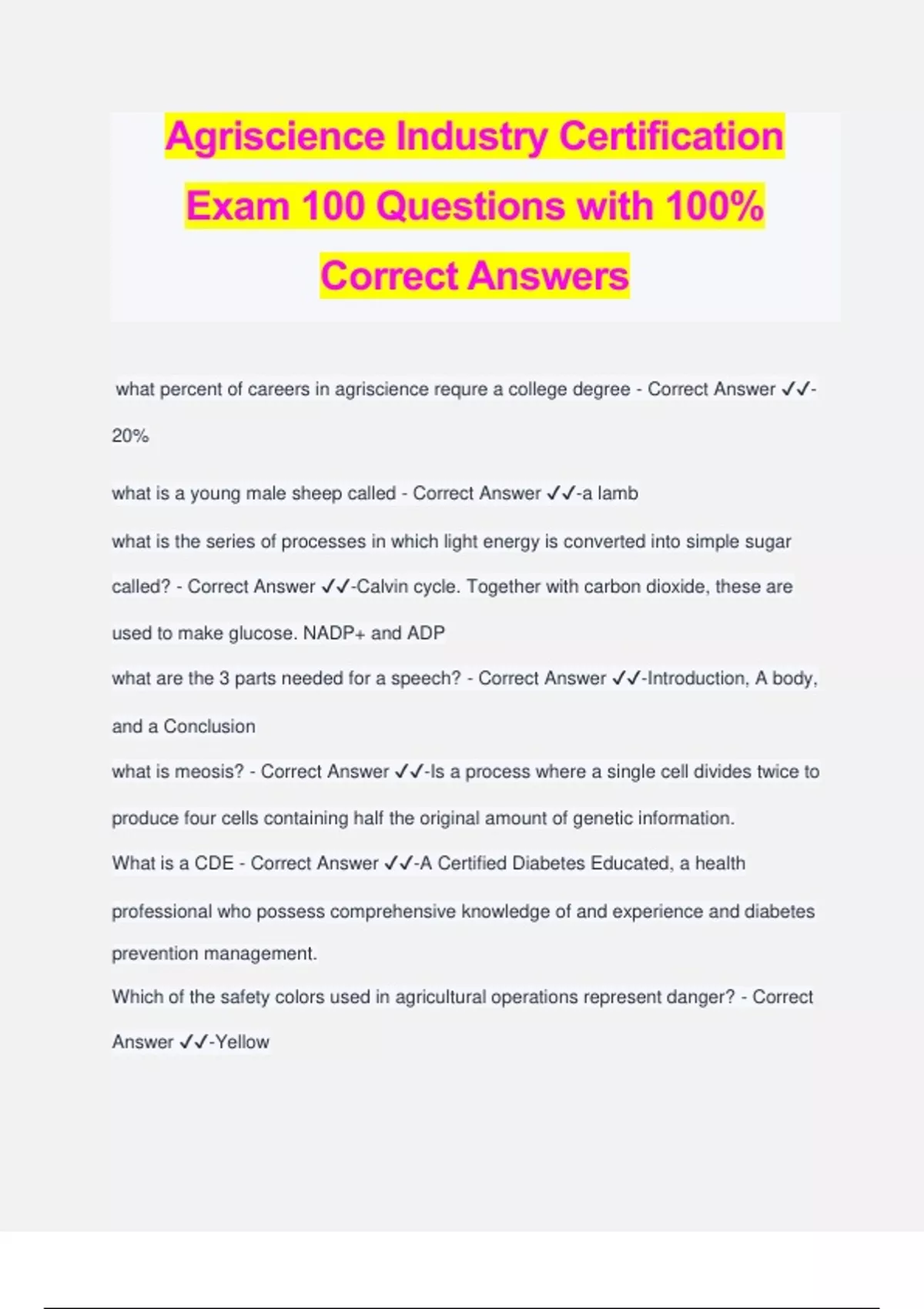 Agriscience Industry Certification Exam 100 Questions with 100% Correct Answers