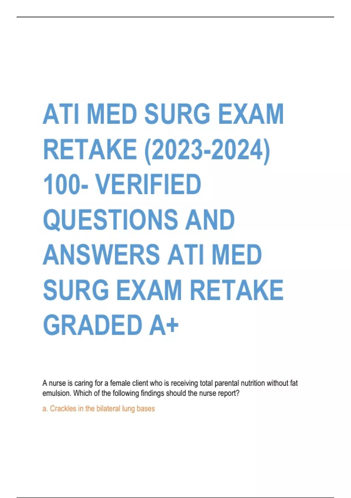 ATI MED SURG EXAM RETAKE () 100- VERIFIED QUESTIONS AND ANSWERS ATI MED SURG EXAM RETAKE GRADED A+ A nurse is caring for a female client who is receiving total parental nutrition without fat emulsion. Which of the following findings should the nurse report? a. Crackles in the bilateral lung bases b. Weight gain of 1.3 kg (3lb) over the past 7 days c. Triglyceride 110 mg/dl d. Bowel sounds absent in lower quadrants - ANS-a. Crackles in the bilateral lung bases A nurse is caring for a client who has a contusion of the brainstem and reports thirst. The client's urinary output was 4,000 ml over the past 24 hour. The nurse should anticipate a prescription for which of the following IV medication? a. Desmopressin b. Epinephrine c. Furosemide d. Nitroprusside - ANS-a. Desmopressin A nurse in a clinic receives a phone call from a client who recently started therapy with an ACE inhibitor and reports a nagging dry cough. Which of the following responses by the nurse is appropriate? a. "your cough may require that you stop or change your medication" b. "Increasing your daily fluid intake may eliminate your cough" c. "sucking on lozenge may reduce the frequency of your cough" d. You cough should go away in time" - ANS-a. "your cough may require that you stop or change your medication" A nurse is taking an admission history from a client who reports Raynaud's disease. Which of the following assessment findings should the nurse identify as a potential trigger for exacerbations of Raynaud's? a. Eating a strict vegetarian diet b. A history of herpes zoster c. Taking amiodipine for hypertension