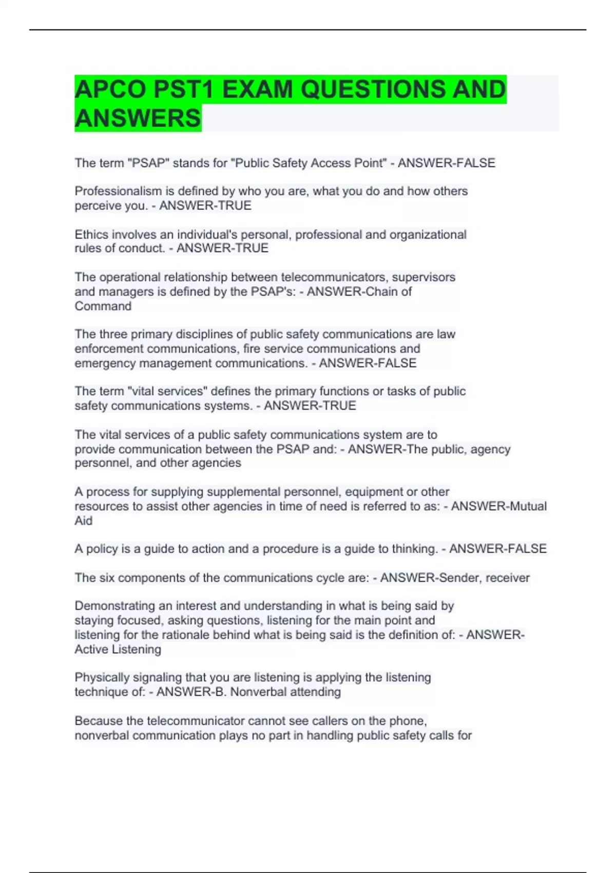 APCO PST1 EXAM QUESTIONS AND ANSWERS