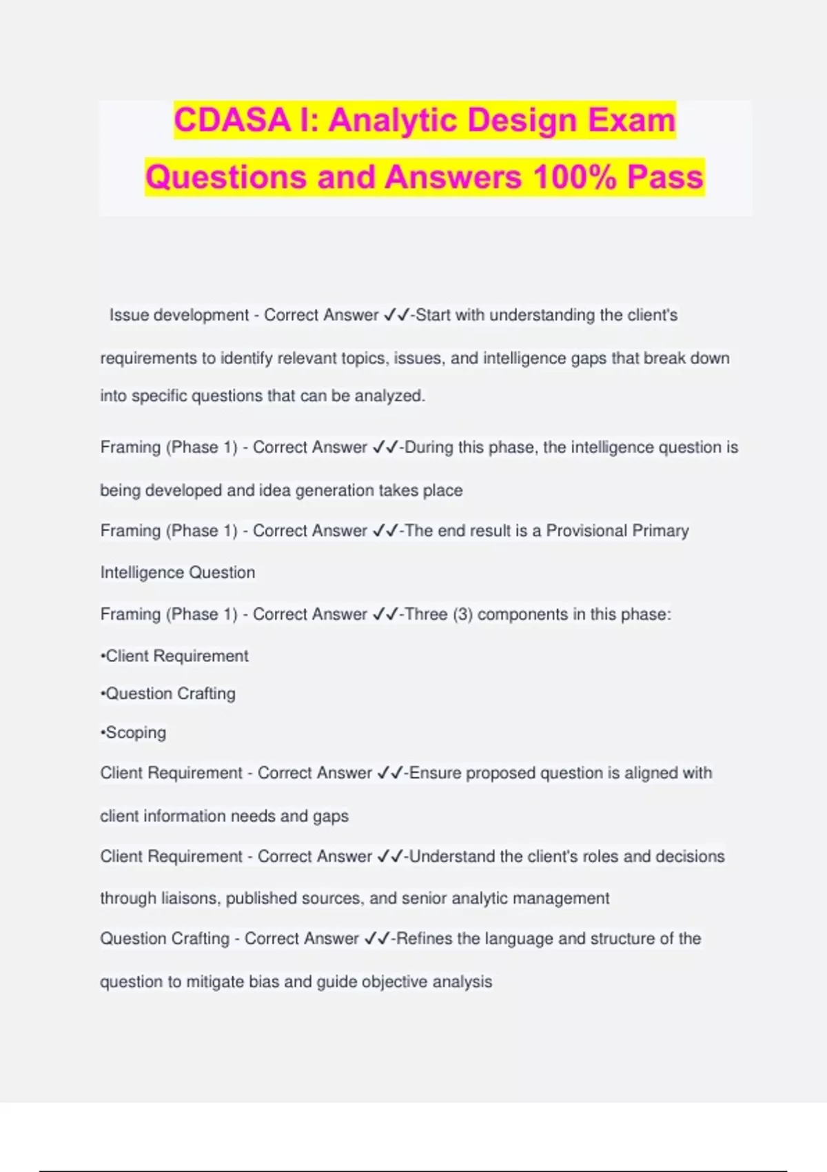 CDASA I: Analytic Design Exam Questions and Answers 100% Pass Issue development - Correct Answer ️️ -Start with understanding the client's requirements to identify relevant topics, issues, and intelligence gaps that break down into specific questions that can be analyzed. Framing (Phase 1) - Correct Answer ️️ -During this phase, the intelligence question is being developed and idea generation takes place Framing (Phase 1) - Correct Answer ️️ -The end result is a Provisional Primary Intelligence Question Framing (Phase 1) - Correct Answer ️️ -Three (3) components in this phase: •Client Requirement •Question Crafting •Scoping Client Requirement - Correct Answer ️️ -Ensure proposed question is aligned with client information needs and gaps Client Requirement - Correct Answer ️️ -Understand the client's roles and decisions through liaisons, published sources, and senior analytic management Question Crafting - Correct Answer ️️ -Refines the language and structure of the question to mitigate bias and guide objective analysis Question Crafting - Correct Answer ️️ -A good question doesn't presume an outcome, allows for multiple answers, and is as expansive as necessary for the client Scoping - Correct Answer ️️ -Develop critical subquestions that provide relevant context for the primary question and encourage inclusive thinking Scoping - Correct Answer ️️ -Uses tools such as decomposition, categorical thinking, and POP Scoping - Correct Answer ️️ -Determine the order of analysis for subquestions and research topics Knowledge Review (Phase 2) - Correct Answer ️️ -During this phase, a Key Assumptions Checkis conducted with regard to the Provisional Primary Intelligence Question Knowledge Review (Phase 2) - Correct Answer ️️ -Three (3) components in this phase: •Available Knowledge •Collection Posture •Critical Gaps Available Knowledge - Correct Answer ️️ -Use the primary question and subquestions to guide review of current, relevant info Available Knowledge - Correct Answer ️️ -Review published sources and unpublished data holdings to determine what info is available to answer the question Collection Posture - Correct Answer ️️ -Determine if all available sources are optimized to collect info relevant to the question (review incoming reporting) Collection Posture - Correct Answer ️️ -Determine if changes in collection posture are needed Critical Gaps - Correct Answer ️️ -Compare available information to the primary question/subquestions to determine where information gaps exist (where accessible, relevant info is not available) Critical Gaps - Correct Answer ️️ -List critical info gaps to inform knowledge development plans Resource Picture (Phase 3) - Correct Answer ️️ -During this phase,