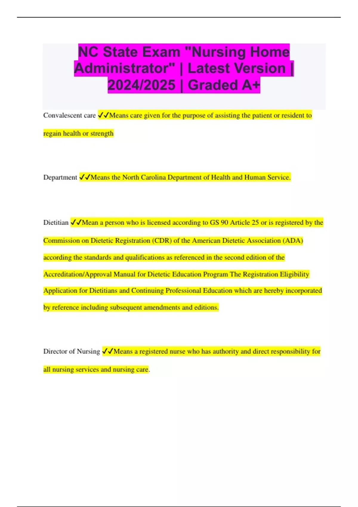 NC State Exam "Nursing Home Administrator" | Latest Version | 2024/2025 | Graded A+ Convalescent care Means care given for the purpose of assisting the patient or resident to regain health or strength Department Means the North Carolina Department of Health and Human Service. Dietitian Mean a person who is licensed according to GS 90 Article 25 or is registered by the Commission on Dietetic Registration (CDR) of the American Dietetic Association (ADA) according the standards and qualifications as referenced in the second edition of the Accreditation/Approval Manual for Dietetic Education Program The Registration Eligibility Application for Dietitians and Continuing Professional Education which are hereby incorporated by reference including subsequent amendments and editions. Director of Nursing Means a registered nurse who has authority and direct responsibility for all nursing services and nursing care. Discharge Means a patient who physically relocates to another health care setting or is discharged home or relocated from a nursing bed to an adult care home bed or from an adult care home bed to a nursing bed. Drug Means substance: a) recognized in the official United States Pharmacopeia, official National Formulary, or any supplement to any of them b) intended for use in the diagnosis, sure, mitigation, treatment, or prevention of disease in man or other animals c) intended to affect the structure or any function of the body of man or other ie substances other than food d) intended for use as a component of any article specified in Subitems a, b, c, of this subchapter. Existing Facility Means a facility currently licensed or proposed facility, proposed addition to a licensed facility or proposed remodeled facility that will be built according to plans and specifications which have been approved by the Department through the design development. Exit Conference Means the conference held at the end of a survey or investigation between the Department's representatives and the facility administration representative. Abuse Mean the willful infliction of injury, unreasonable confinement, intimidation or punishment with resulting physical harm, pain or mental anguish.