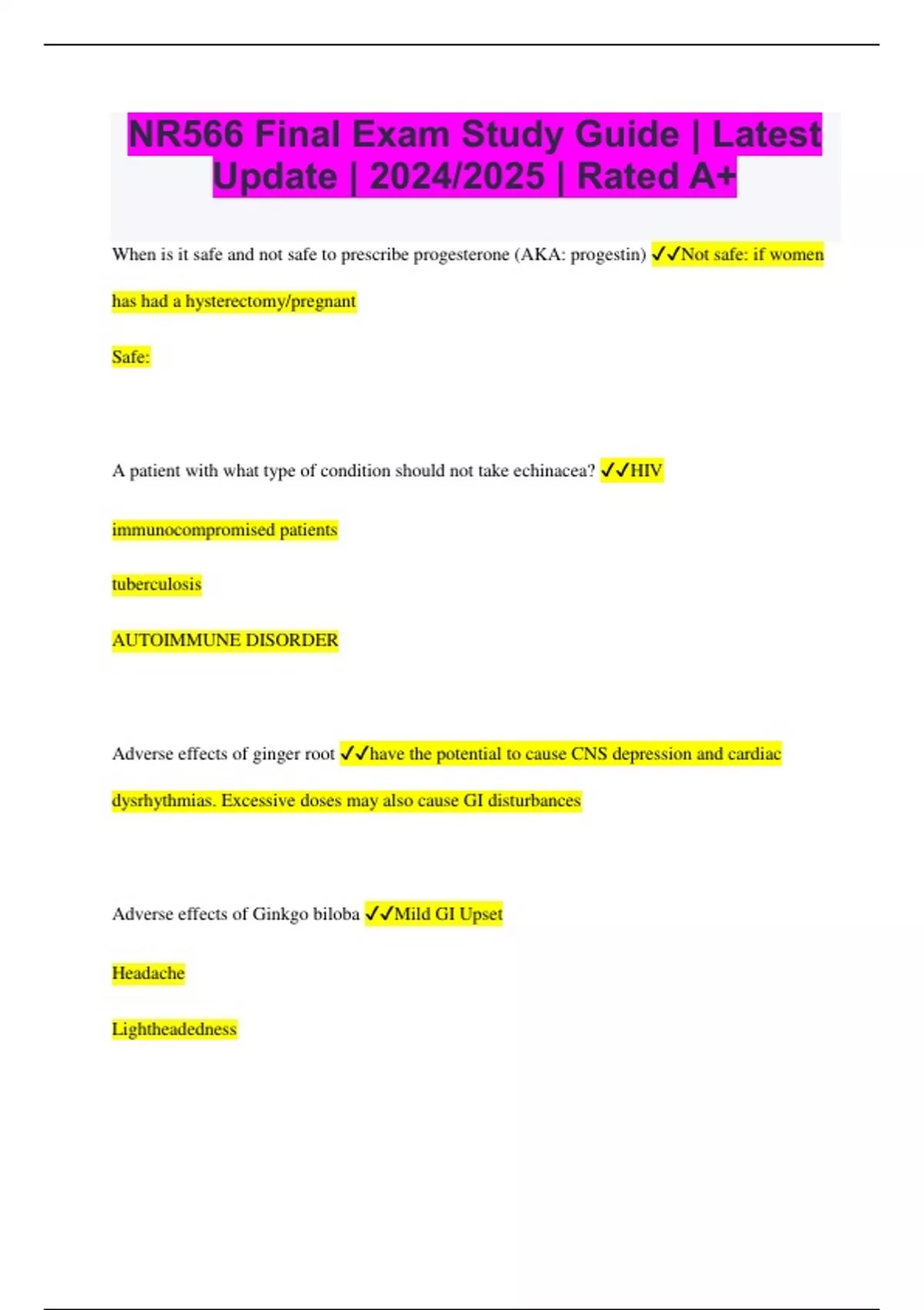 NR566 Final Exam Study Guide | Latest Update | 2024/2025 | Rated A+ When is it safe and not safe to prescribe progesterone (AKA: progestin) Not safe: if women has had a hysterectomy/pregnant Safe: A patient with what type of condition should not take echinacea? HIV immunocompromised patients tuberculosis AUTOIMMUNE DISORDER Adverse effects of ginger root have the potential to cause CNS depression and cardiac dysrhythmias. Excessive doses may also cause GI disturbances Adverse effects of Ginkgo biloba Mild GI Upset Headache Lightheadedness Side Effects reduced by reducing dose Taken precautious in patients at risk for seizures Adverse effects of Kava severe liver injury, hepatotoxicity Adverse effects of St Johns wort Allergic skin reactions may occur, especially in people allergic to ragweed and daisies. In addition, the herb may cause CNS effects (e.g., insomnia, vivid dreams, restlessness, anxiety, agitation, and irritability), as well as GI discomfort, fatigue, dry mouth, and headache. High-dose therapy may pose a risk for phototoxicity Alprostadil (for ED). Benefits of various routes The injection needs to be done by the patient or in ER setting: rapidly leads to erection, painless Intraurethral pellet insertion: can be done by the patient, an erection occurs within 5-10 mins and lasts 30-60 min. minimal side effects Alzheimer's. Rivastigmine Patient teaching can cause bradycardia, fainting, fall, and fall-related fractures. family teaching how to prevent fall at home