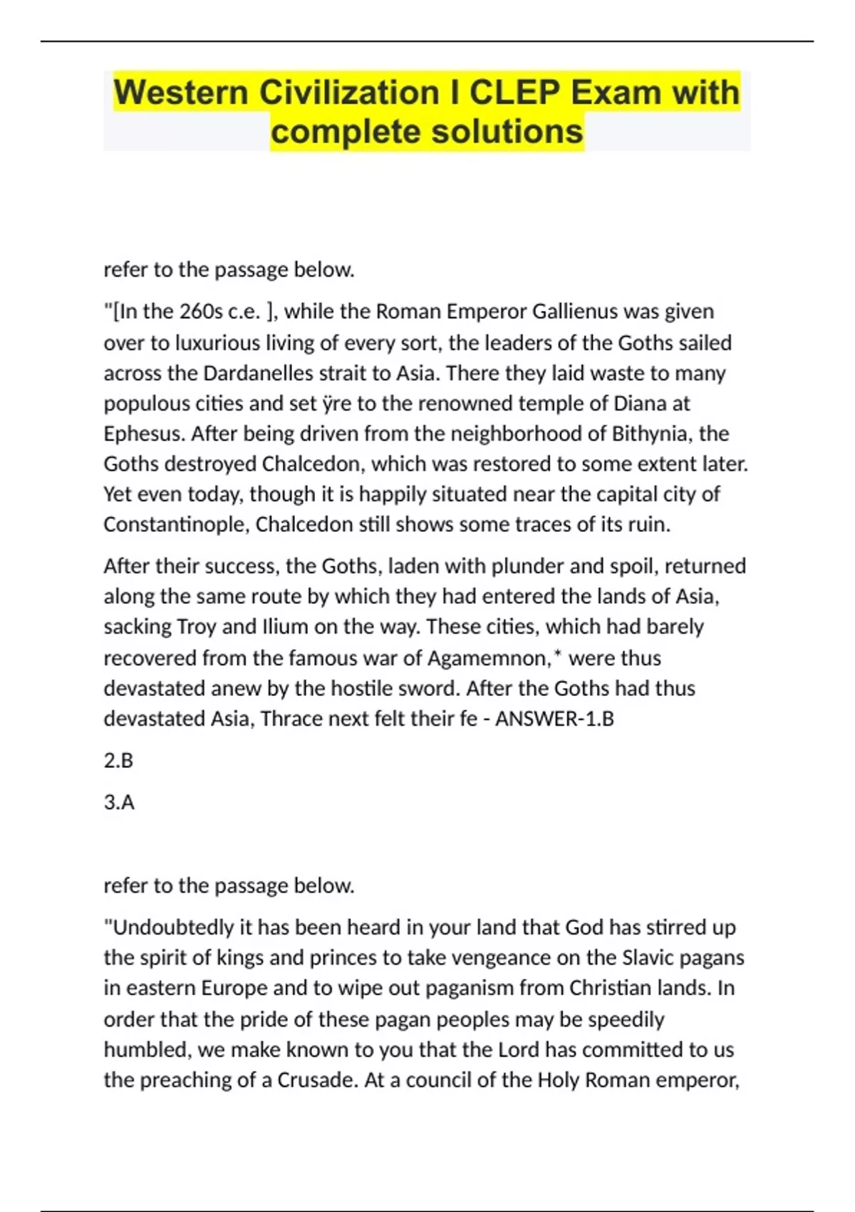 refer to the passage below. "[In the 260s c.e. ], while the Roman Emperor Gallienus was given over to luxurious living of every sort, the leaders of the Goths sailed across the Dardanelles strait to Asia. There they laid waste to many populous cities and set ÿre to the renowned temple of Diana at Ephesus. After being driven from the neighborhood of Bithynia, the Goths destroyed Chalcedon, which was restored to some extent later. Yet even today, though it is happily situated near the capital city of Constantinople, Chalcedon still shows some traces of its ruin. After their success, the Goths, laden with plunder and spoil, returned along the same route by which they had entered the lands of Asia, sacking Troy and Ilium on the way. These cities, which had barely recovered from the famous war of Agamemnon,* were thus devastated anew by the hostile sword. After the Goths had thus devastated Asia, Thrace next felt their fe - ANSWER-1.B 2.B 3.A refer to the passage below. "Undoubtedly it has been heard in your land that God has stirred up the spirit of kings and princes to take vengeance on the Slavic pagans in eastern Europe and to wipe out paganism from Christian lands. In order that the pride of these pagan peoples may be speedily humbled, we make known to you that the Lord has committed to us the preaching of a Crusade. At a council of the Holy Roman emperor, the bishops, and the princes at Frankfurt, all of them took the cross. All Christians who have not yet taken the cross for Jerusalem should know that they will receive the same spiritual privileges for undertaking this expedition against the pagans in eastern Europe. We utterly forbid for any reason whatsoever that a truce be made with these pagans until they shall be converted or wiped out." Bernard of Clairvaux, letter addressed to the Christian nobility and people, Frankfurt, Holy Roman Empire, - ANSWER-4.D 5.B 6. The earliest urban settlements usually arose in which of the following types of areas? (A) Coastal plains(B) Inland deforested plains(C) Desert oases(D) Fertile river valleys(E) Narrow valleys well protected by mountains - ANSWER-6.D (photo saved to desktop) 7. The panel above from ancient Ur supports which of the following conclusions about Mesopotamian society? (A) It was primarily composed of hunter-gatherers. (B) It had distinct class divisions. (C) Religion pervaded daily life. (D) Soldiers were drawn primarily from the nobility. (E) Most commoners were slaves. - ANSWER-7.B 8. Pharaoh Akhenaten of Egypt (c. b.c.e.) is best known today for (A) building the largest pyramid in the Valley of the Kings (B) conquering large expanses of territory outside of the Nile Valley (C) developing a monotheistic religion (D) uniting upper and lower Egypt under a single administrative system (E) writing down the first code of Egyptian law - ANSWER-8.C 9. The outstanding achievement of King Hammurabi of Mesopotamia was that he (A) issued a more comprehensive law code than had any known predecessor (B) conquered and established dominion over all of Egypt (C) built the Hanging Gardens of Babylon (D) established the first democratic government (E) successfully defended his kingdom against the Assyrians - ANSWER-9.A 10. Which of the following most directly facilitated the emergence of numerous independent city- states in ancient Greece? (A) Persian meddling in the political affairs of Greece (B) The expansion of long-distance trade in the Mediterranean (C) Greece's location along the sea, which allowed numerous states to acquire powerful navies (D) The association of Greek gods with particular localities (E) Greece's mountainous terrain, which made communications difficult - ANSWER-10.E 11. All of the following were emphasized by the early Christian church EXCEPT a (A) ritual fellowship meal in memory of Christ (B) toleration of other religious sects (C) belief in the value of the souls of women and slaves as well as those of free men (D) belief in life after death for all believers in Christ (E) belief in the value of martyrdom, defined as dying for the faith - ANSWER-11.B 12. The Roman emperor whose policies rescued Rome from its crisis in the third century c.e. was (A) Augustus (B) Marcus Aurelius (C) Constantine (D) Diocletian (E) Theodosius - ANSWER-12.D 13. Which of the following established Christianity as a legal religion in the Roman Empire? (A) The defeat of the Huns, 451 c.e. (B) The accession of Justinian I (C) The Council of Nicaea (D) The accession of Diocletian (E) The Edict of Milan - ANSWER-13.E 14. All of the following invaded the Roman Empire EXCEPT the (A) Vikings (B) Ostrogoths (C) Visigoths (D) Vandals (E) Huns - ANSWER-14.A 15. The craft guilds of the Middle Ages had as their primary purpose the (A) promotion of trade and the protection of merchants (B) control of town government (C) regulation of production and quality (D) guardianship of the social and financial affairs of their members (E) accumulation of capital and the lending of money - ANSWER-15.C 16. Which of the following had the greatest impact on northern European agriculture by the year 1000 c.e.? (A) The wheeled seed drill (B) The enclosure movement (C) The padded horse collar (D) The horse saddle (E) The spread of maize (corn) cultivation - ANSWER-16.C 17. The orders of Franciscan and Dominican friars founded in the thirteenth century differed from earlier monastic orders principally in that the friars (A) took vows of poverty, chastity, and obedience (B) broke away from the control of the pope (C) introduced the ideas of Plato and other early Greek philosophers into their teaching (D) devoted themselves mainly to copying ancient manuscripts (E) traveled among the people instead of living in monasteries - ANSWER-17.E 18. All of the following factors played a part in bringing about the Hundred Years' War EXCEPT (A) The English king had lands in Gascony. (B) A French princess was the mother of an English king. (C) Flemish towns were dependent on England f