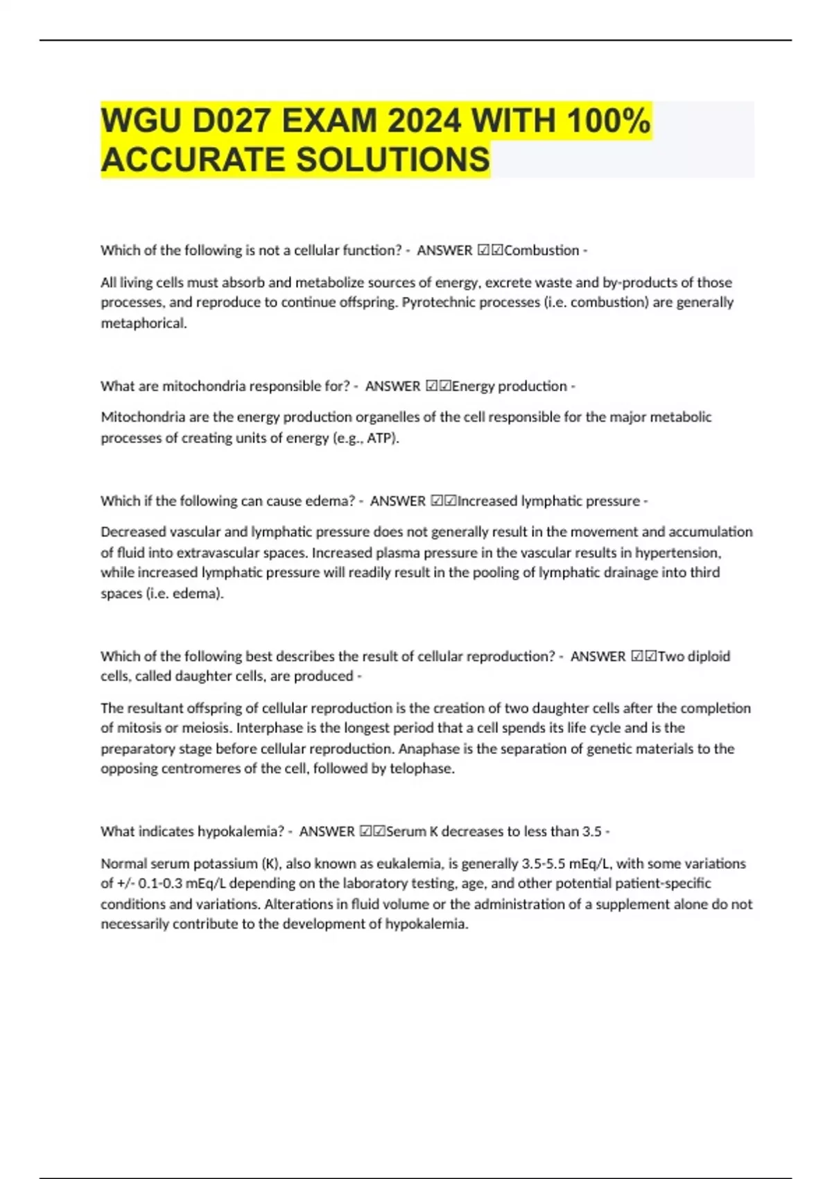 WGU D027 EXAM 2024 WITH 100% ACCURATE SOLUTIONS Which of the following is not a cellular function? - ANSWER ☑☑Combustion - All living cells must absorb and metabolize sources of energy, excrete waste and by-products of those processes, and reproduce to continue offspring. Pyrotechnic processes (i.e. combustion) are generally metaphorical. What are mitochondria responsible for? - ANSWER ☑☑Energy production - Mitochondria are the energy production organelles of the cell responsible for the major metabolic processes of creating units of energy (e.g., ATP). Which if the following can cause edema? - ANSWER ☑☑Increased lymphatic pressure - Decreased vascular and lymphatic pressure does not generally result in the movement and accumulation of fluid into extravascular spaces. Increased plasma pressure in the vascular results in hypertension, while increased lymphatic pressure will readily result in the pooling of lymphatic drainage into third spaces (i.e. edema).
