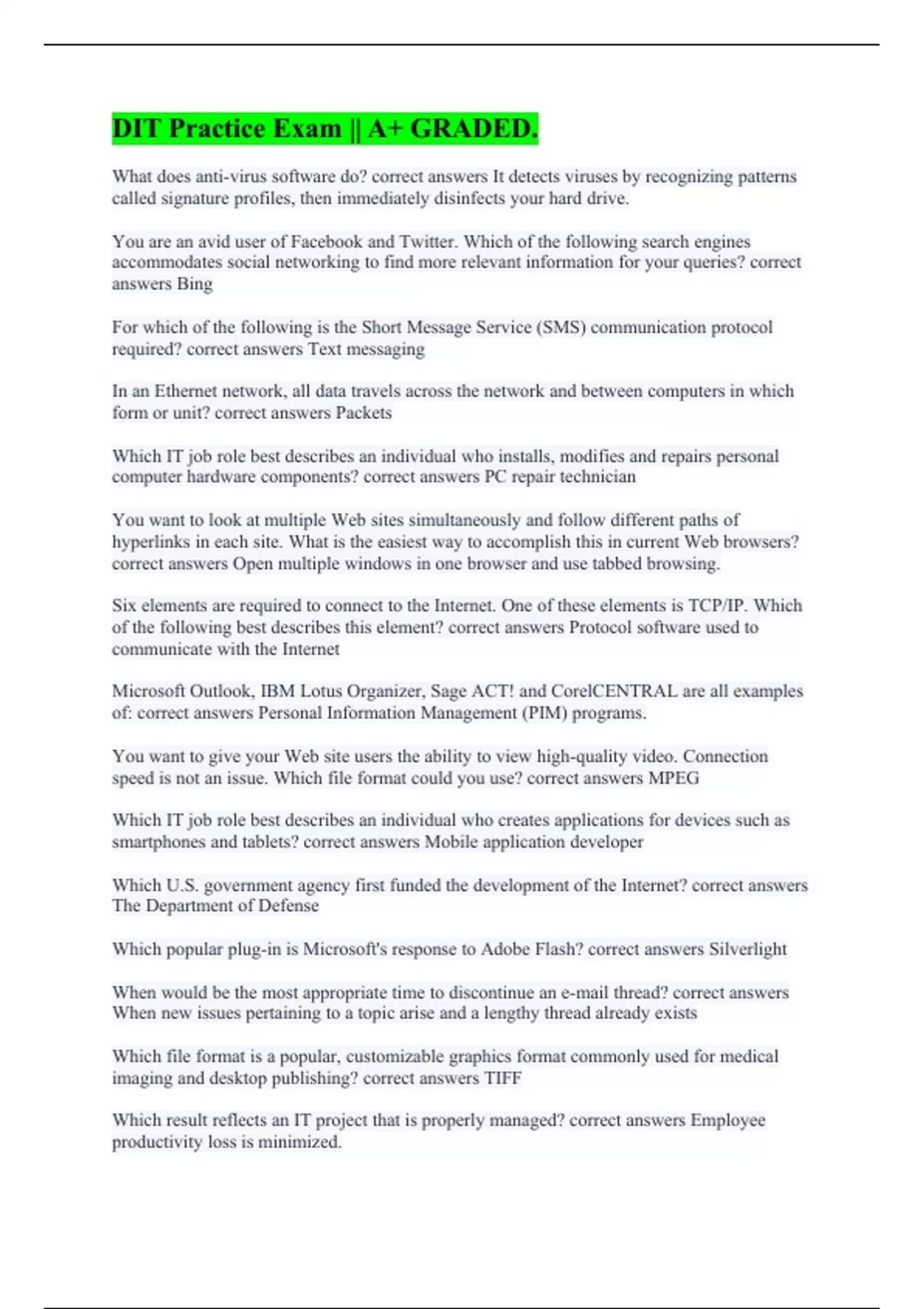 What does anti-virus software do? correct answers It detects viruses by recognizing patterns called signature profiles, then immediately disinfects your hard drive. You are an avid user of Facebook and Twitter. Which of the following search engines accommodates social networking to find more relevant information for your queries? correct answers Bing For which of the following is the Short Message Service (SMS) communication protocol required? correct answers Text messaging In an Ethernet network, all data travels across the network and between computers in which form or unit? correct answers Packets Which IT job role best describes an individual who installs, modifies and repairs personal computer hardware components? correct answers PC repair technician You want to look at multiple Web sites simultaneously and follow different paths of hyperlinks in each site. What is the easiest way to accomplish this in current Web browsers? correct answers Open multiple windows in one browser and use tabbed browsing. Six elements are required to connect to the Internet. One of these elements is TCP/IP. Which of the following best describes this element? correct answers Protocol software used to communicate with the Internet Microsoft Outlook, IBM Lotus Organizer, Sage ACT! and CorelCENTRAL are all examples of: correct answers Personal Information Management (PIM) programs. You want to give your Web site users the ability to view high-quality video. Connection speed is not an issue. Which file format could you use? correct answers MPEG Which IT job role best describes an individual who creates applications for devices such as smartphones and tablets? correct answers Mobile application developer Which U.S. government agency first funded the development of the Internet? correct answers The Department of Defense Which popular plug-in is Microsoft's response to Adobe Flash? correct answers Silverlight When would be the most appropriate time to discontinue an e-mail thread? correct answers When new issues pertaining to a topic arise and a lengthy thread already exists Which file format is a popular, customizable graphics format commonly used for medical imaging and desktop publishing? correct answers TIFF Which result reflects an IT project that is properly managed? correct answers Employee productivity loss is minimized.