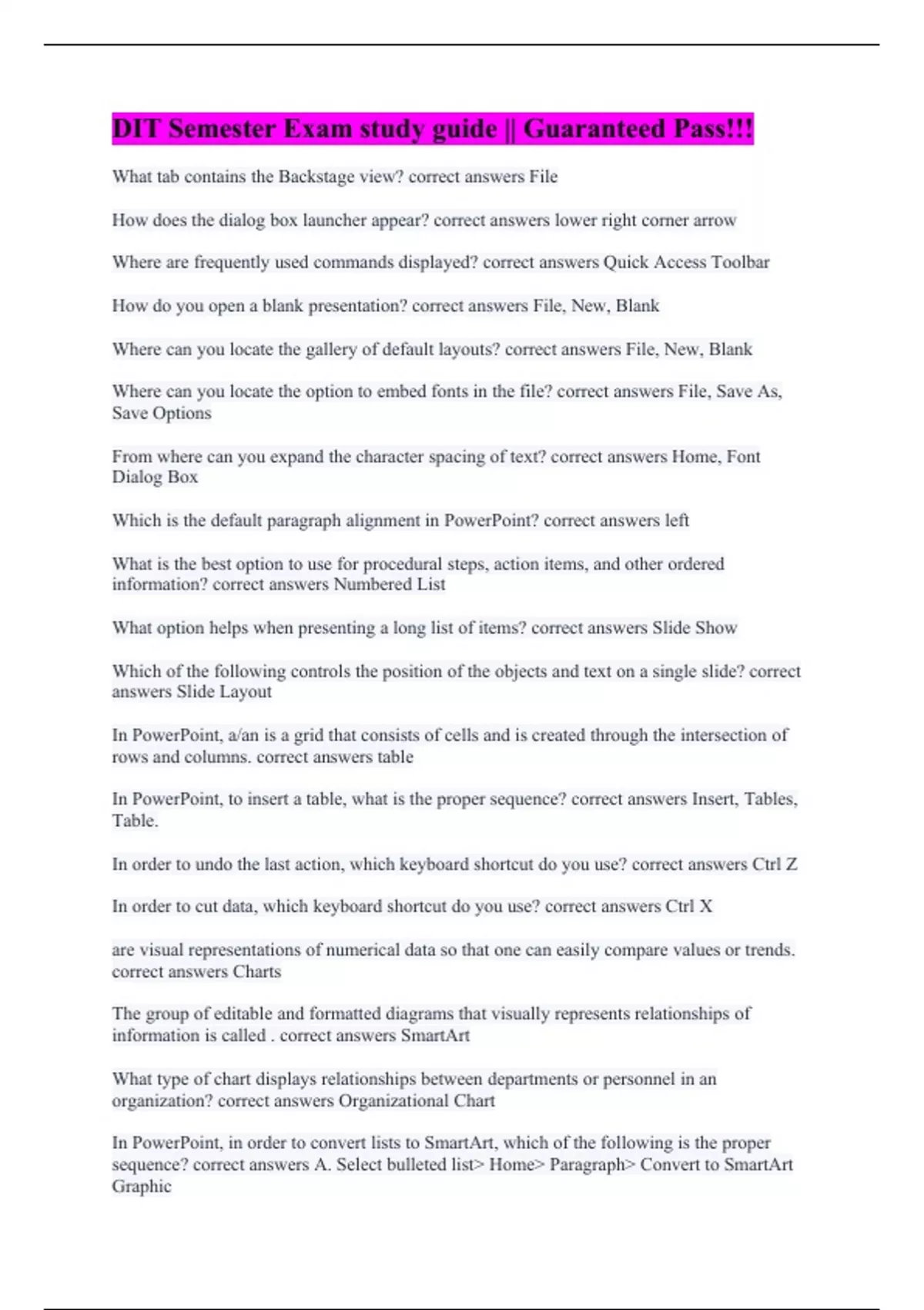 What tab contains the Backstage view? correct answers File How does the dialog box launcher appear? correct answers lower right corner arrow Where are frequently used commands displayed? correct answers Quick Access Toolbar How do you open a blank presentation? correct answers File, New, Blank Where can you locate the gallery of default layouts? correct answers File, New, Blank Where can you locate the option to embed fonts in the file? correct answers File, Save As, Save Options From where can you expand the character spacing of text? correct answers Home, Font Dialog Box Which is the default paragraph alignment in PowerPoint? correct answers left What is the best option to use for procedural steps, action items, and other ordered information? correct answers Numbered List What option helps when presenting a long list of items? correct answers Slide Show Which of the following controls the position of the objects and text on a single slide? correct answers Slide Layout In PowerPoint, a/an is a grid that consists of cells and is created through the intersection of rows and columns. correct answers table In PowerPoint, to insert a table, what is the proper sequence? correct answers Insert, Tables, Table. In order to undo the last action, which keyboard shortcut do you use? correct answers Ctrl Z In order to cut data, which keyboard shortcut do you use? correct answers Ctrl X are visual representations of numerical data so that one can easily compare values or trends. correct answers Charts The group of editable and formatted diagrams that visually represents relationships of information is called . correct answers SmartArt What type of chart displays relationships between departments or personnel in an organization? correct answers Organizational Chart In PowerPoint, in order to convert lists to SmartArt, which of the following is the proper sequence? correct answers A. Select bulleted list Home Paragraph Convert to SmartArt Graphic