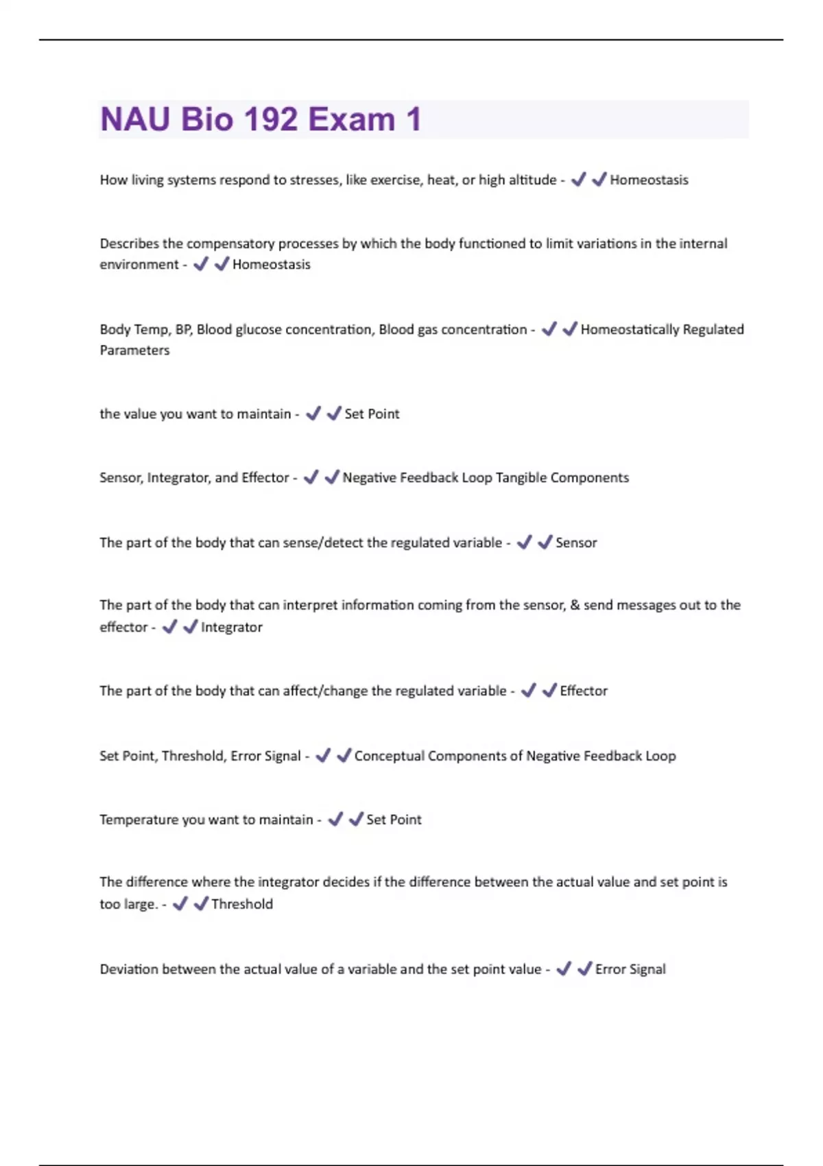 How living systems respond to stresses, like exercise, heat, or high altitude - Homeostasis Describes the compensatory processes by which the body functioned to limit variations in the internal environment - Homeostasis Body Temp, BP, Blood glucose concentration, Blood gas concentration - Homeostatically Regulated Parameters the value you want to maintain - Set Point Sensor, Integrator, and Effector - Negative Feedback Loop Tangible Components The part of the body that can sense/detect the regulated variable - Sensor The part of the body that can interpret information coming from the sensor, & send messages out to the effector - Integrator The part of the body that can affect/change the regulated variable - Effector Set Point, Threshold, Error Signal - Conceptual Components of Negative Feedback Loop Temperature you want to maintain - Set Point The difference where the integrator decides if the difference between the actual value and set point is too large. - Threshold Deviation between the actual value of a variable and the set point value - Error SignalSet Point temperature in the body - 37 Degrees Celsius Nutrient and oxygen use, waste production, and heat production - Exercise increases what rates A parameter is constant over a period of time. - Steady State Adenine, Ribose, Triphosphate - What are the 3 parts of ATP made up of carbon, hydrogen, & nitrogen atoms - Adenine sugar molecule - Ribose linked in a chain attached to ribose - Triphosphate Made of carbon, hydrogen, and oxygen - Carbohydrates simplest sugar; ex. glucose - Monosaccharide Sucrose; ex. sugar packet - Disaccharide Combination of glucose and fructose - Disaccharide Lactose; sugar in milk - Disaccharide 3 or more sugars - Polysaccharide Plants storage form of carbohydrate polysaccharide - StarchAnimals storage form of carbohydrate polysaccharide - Glycogen made of carbon and hydrogen atoms - Fat