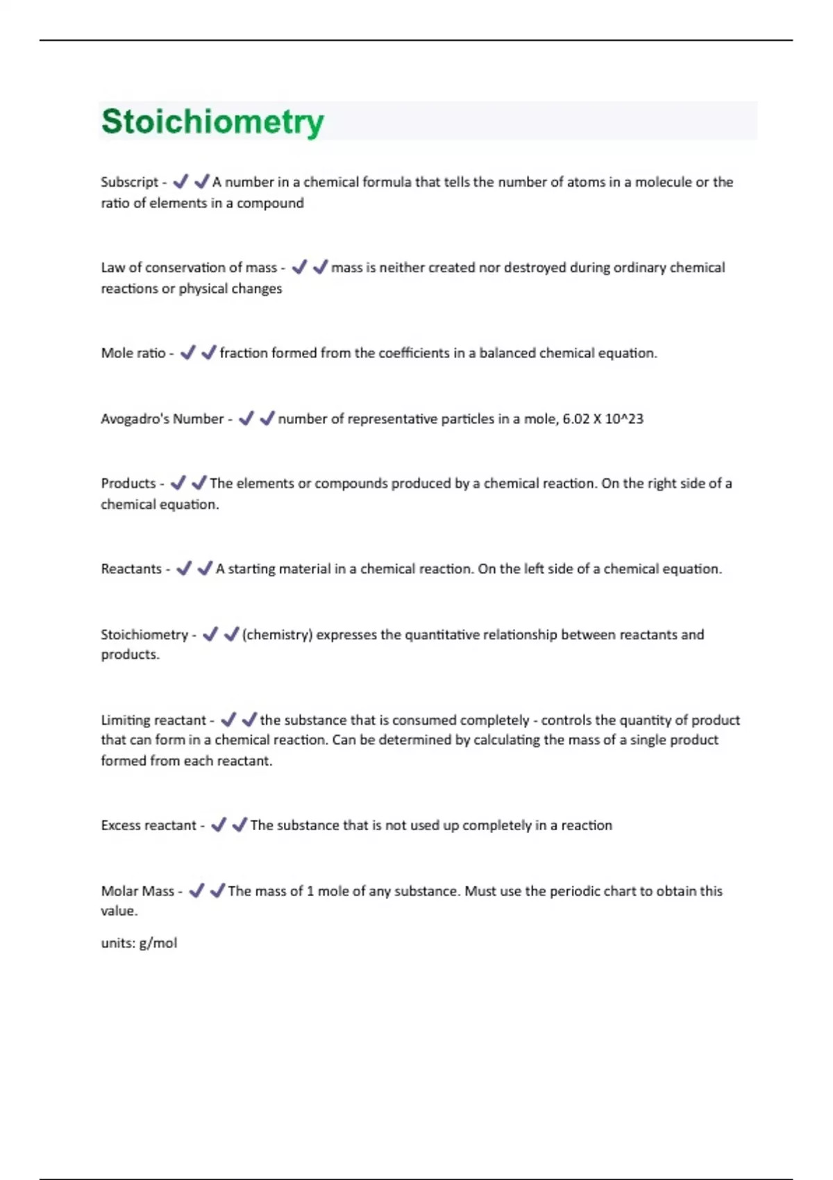 Subscript - A number in a chemical formula that tells the number of atoms in a molecule or the ratio of elements in a compound Law of conservation of mass - mass is neither created nor destroyed during ordinary chemical reactions or physical changes Mole ratio - fraction formed from the coefficients in a balanced chemical equation. Avogadro's Number - number of representative particles in a mole, 6.02 X 10^23 Products - The elements or compounds produced by a chemical reaction. On the right side of a chemical equation. Reactants - A starting material in a chemical reaction. On the left side of a chemical equation. Stoichiometry - (chemistry) expresses the quantitative relationship between reactants and products. Limiting reactant - the substance that is consumed completely - controls the quantity of product that can form in a chemical reaction. Can be determined by calculating the mass of a single product formed from each reactant. Excess reactant - The substance that is not used up completely in a reaction Molar Mass - The mass of 1 mole of any substance. Must use the periodic chart to obtain this value. units: g/molBalanced Chemical Equation - Allows one to determine the mole ratio of any two substances in the reaction 1st step in a stoichiometry problem - Write the "given" and what you "want" mass of one mole of a diatomic element (hydrogen, nitrogen, oxygen, fluorine, chlorine, bromine, iodine) - twice the mass listed for that element on the periodic chart molar mass of a compound - the sum of the masses listed on the periodic chart of the atoms contained in it 2nd step in solving stoichiometry problem - travel the unit (what is says on the top, travels to bottom part in the picket fence) significant figures - a prescribed decimal place that determines the amount of rounding off to be done based on the precision of the measurement percent yield - the ratio of the actual yield to the theoretical yield expressed as a percent empirical formula - a formula with the lowest whole-number ratio of elements in a compound Coefficient - A number in front of a chemical formula in an equation that indicates how many molecules or atoms of each reactant and product are involved in a reaction.
