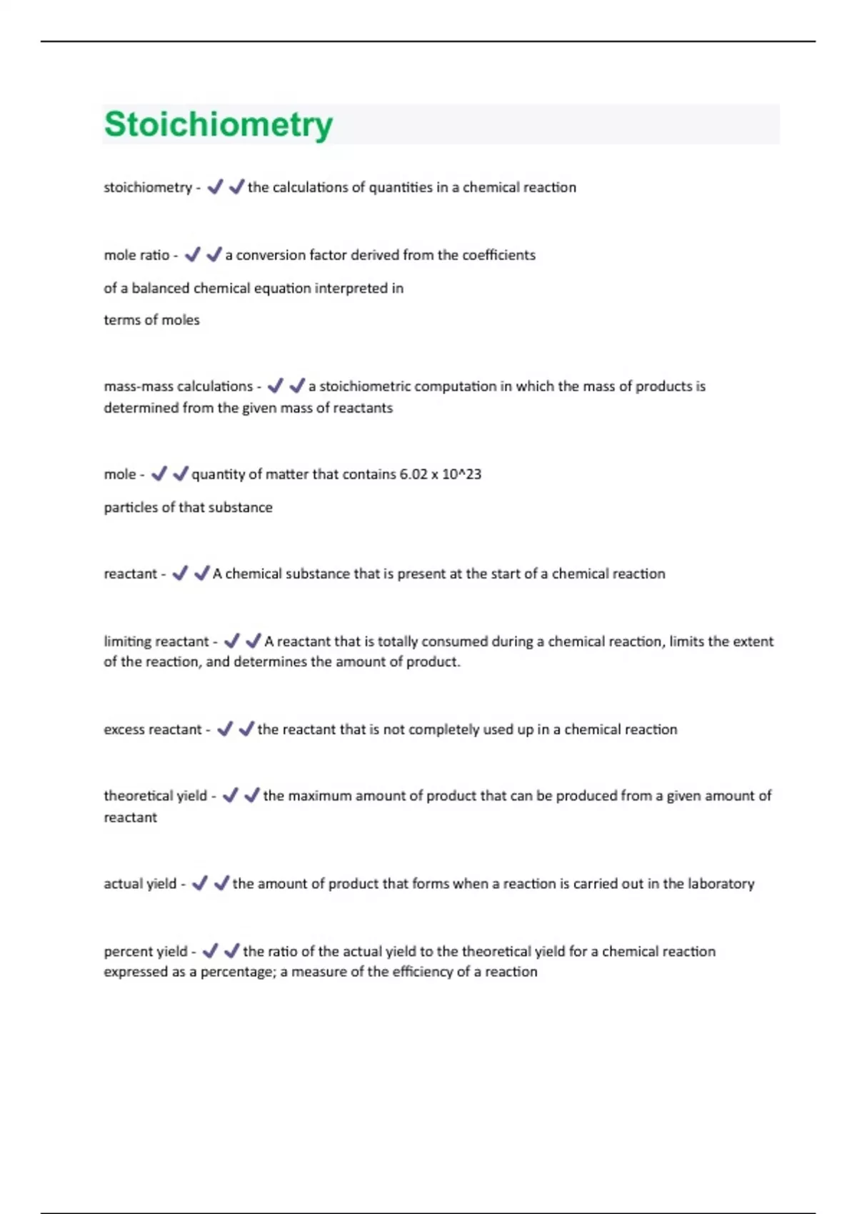 stoichiometry - the calculations of quantities in a chemical reaction mole ratio - a conversion factor derived from the coefficients of a balanced chemical equation interpreted in terms of moles mass-mass calculations - a stoichiometric computation in which the mass of products is determined from the given mass of reactants mole - quantity of matter that contains 6.02 x 10^23 particles of that substance reactant - A chemical substance that is present at the start of a chemical reaction limiting reactant - A reactant that is totally consumed during a chemical reaction, limits the extent of the reaction, and determines the amount of product. excess reactant - the reactant that is not completely used up in a chemical reaction theoretical yield - the maximum amount of product that can be produced from a given amount of reactant actual yield - the amount of product that forms when a reaction is carried out in the laboratory percent yield - the ratio of the actual yield to the theoretical yield for a chemical reaction expressed as a percentage; a measure of the efficiency of a reaction