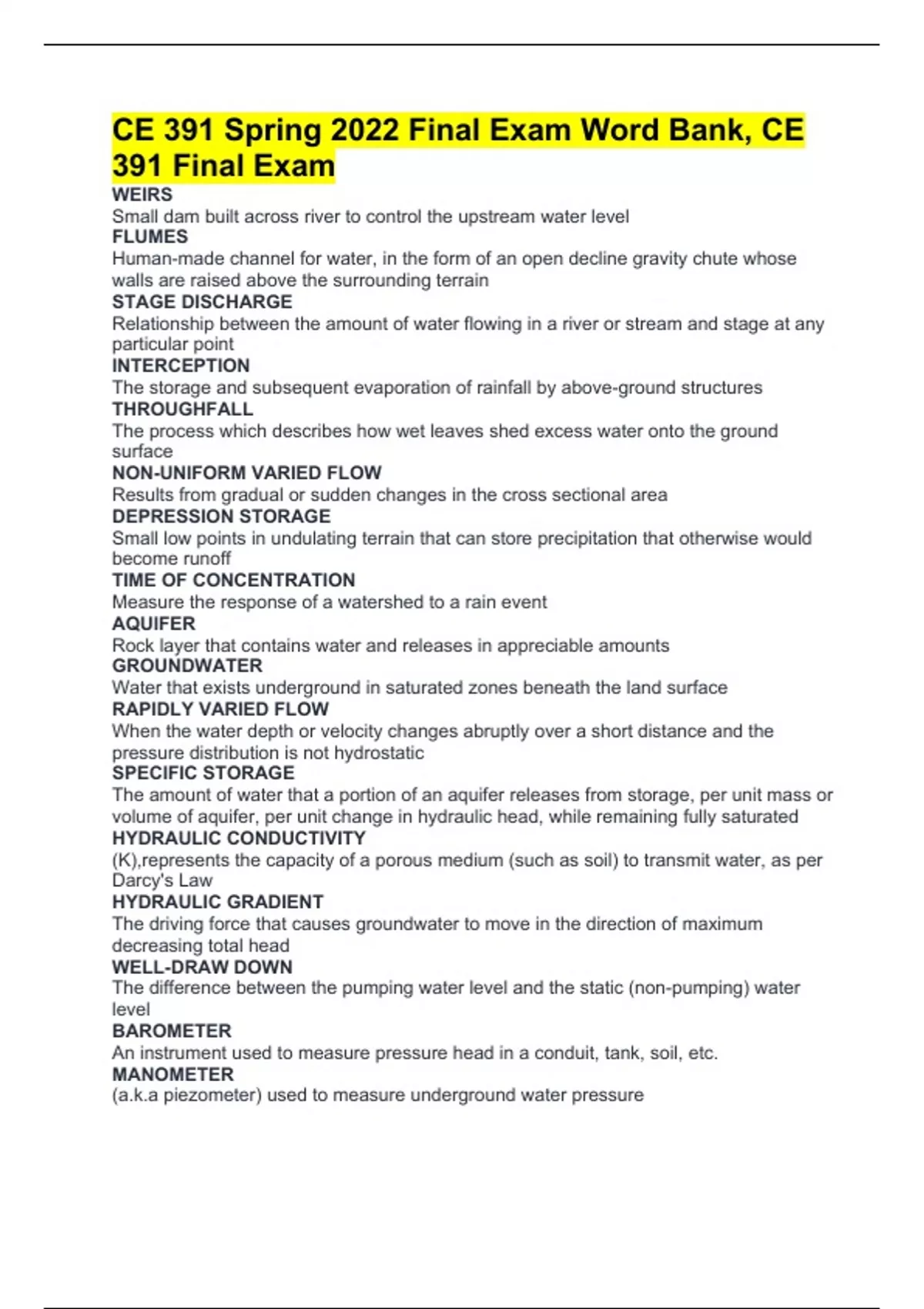 CE 391 Spring 2022 Final Exam Word Bank, CE 391 Final Exam WEIRS Small dam built across river to control the upstream water level FLUMES Human-made channel for water, in the form of an open decline gravity chute whose walls are raised above the surrounding terrain STAGE DISCHARGE Relationship between the amount of water flowing in a river or stream and stage at any particular point INTERCEPTION The storage and subsequent evaporation of rainfall by above-ground structures THROUGHFALL The process which describes how wet leaves shed excess water onto the ground surface NON-UNIFORM VARIED FLOW Results from gradual or sudden changes in the cross sectional area DEPRESSION STORAGE Small low points in undulating terrain that can store precipitation that otherwise would become runoff TIME OF CONCENTRATION Measure the response of a watershed to a rain event AQUIFER Rock layer that contains water and releases in appreciable amounts GROUNDWATER Water that exists underground in saturated zones beneath the land surface RAPIDLY VARIED FLOW When the water depth or velocity changes abruptly over a short distance and the pressure distribution is not hydrostatic SPECIFIC STORAGE The amount of water that a portion of an aquifer releases from storage, per unit mass or volume of aquifer, per unit change in hydraulic head, while remaining fully saturated HYDRAULIC CONDUCTIVITY (K),represents the capacity of a porous medium (such as soil) to transmit water, as per Darcy's Law HYDRAULIC GRADIENT The driving force that causes groundwater to move in the direction of maximum decreasing total head WELL-DRAW DOWN The difference between the pumping water level and the static (non-pumping) water level BAROMETER An instrument used to measure pressure head in a conduit, tank, soil, etc. MANOMETER (a.k.a piezometer) used to measure underground water pressure DISCHARGE COEFFICIENT Used to model the relationship between flow and headloss through the valve being modeled EQUIVALENT HEIGHT Way of representing changes in the gravity field in hydrological units PRESSURE GRADIENT Slope of the water table or potentiometric surface, that is, the changes in water level per unit of distance along the direction of maximum head decrease GEOMETRIC CRITICAL FLOW The variation of specific energy with a depth at a constant discharge HYDROLOGIC CYCLE WATERSHED Area of land that separates waters flowing to different rivers, basins, or seas GRADUALLY VARIED FLOW Steady non-uniform flow with the velocity of water remaining constant at a specified point AREA OF FLOW EVAPORATION The transfer of liquid water into vapor state to the atmosphere INFILTRATION Process by which water on the ground surface enters the soil VISCOMETER Instrument that measures the fluid flow and viscosity of liquids TUBE TYPE FALLING SPHERE ROTATIONAL PRESSURE TRANSDUCER Pressure transmitters that can measure water pipe pressure BOURDON GAGE Used for the measurement of relative pressure from 0.8 to 100,000 psi LYSIMETER Devices that define a specific boundary to contain soil water and permit measurement of either the soil-water balance or the volume of water percolating vertically and/or its quality EVAPORATION PAN Used to test evaporation of water, measured by comparting depth of water in pan GRAVIMETRIC METHOD A method of quantitative chemicals analysis in which the constituent sought is converted into a substance (of known composition) that can be separated from the sample and weighed INFILTROMETER Device used to measure the rate of water infiltration into soil or other porous media. HYDROMETER Device used to measure characteristics of a liquid, such as density or specific gravity CRITICAL STEP HEIGHT