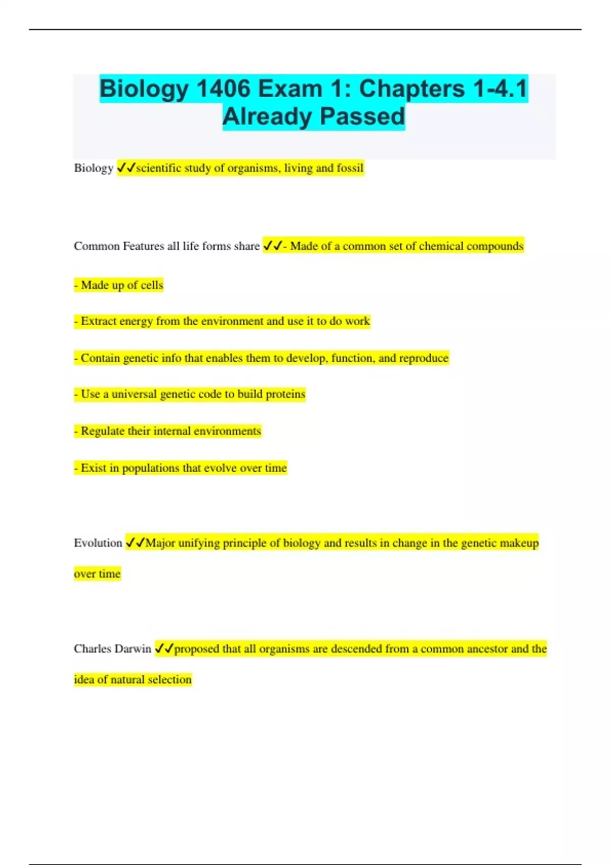 Biology scientific study of organisms, living and fossil Common Features all life forms share - Made of a common set of chemical compounds - Made up of cells - Extract energy from the environment and use it to do work - Contain genetic info that enables them to develop, function, and reproduce - Use a universal genetic code to build proteins - Regulate their internal environments - Exist in populations that evolve over time Evolution Major unifying principle of biology and results in change in the genetic makeup over time Charles Darwin proposed that all organisms are descended from a common ancestor and the idea of natural selectionNatural Selection A natural process resulting in the evolution of organisms best adapted to the environment Phylogenetic Tree Illustrates the evolutionary histories of different groups of organisms Multiple Amino Acids Linked Together Form A ______________ Polypeptide Chain All life is made up of the common set of chemical compounds: Carbs, Lipids, Proteins, Nucleic Acids All life extracts _______ from the environment and uses it to do work