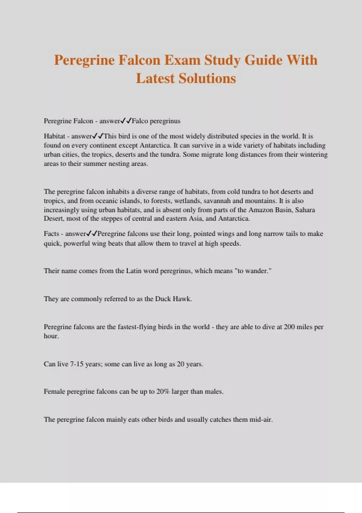 Peregrine Falcon Exam Study Guide With Latest Solutions Peregrine Falcon - answerFalco peregrinus Habitat - answerThis bird is one of the most widely distributed species in the world. It is found on every continent except Antarctica. It can survive in a wide variety of habitats including urban cities, the tropics, deserts and the tundra. Some migrate long distances from their wintering areas to their summer nesting areas. The peregrine falcon inhabits a diverse range of habitats, from cold tundra to hot deserts and tropics, and from oceanic islands, to forests, wetlands, savannah and mountains. It is also increasingly using urban habitats, and is absent only from parts of the Amazon Basin, Sahara Desert, most of the steppes of central and eastern Asia, and Antarctica. Facts - answerPeregrine falcons use their long, pointed wings and long narrow tails to make quick, powerful wing beats that allow them to