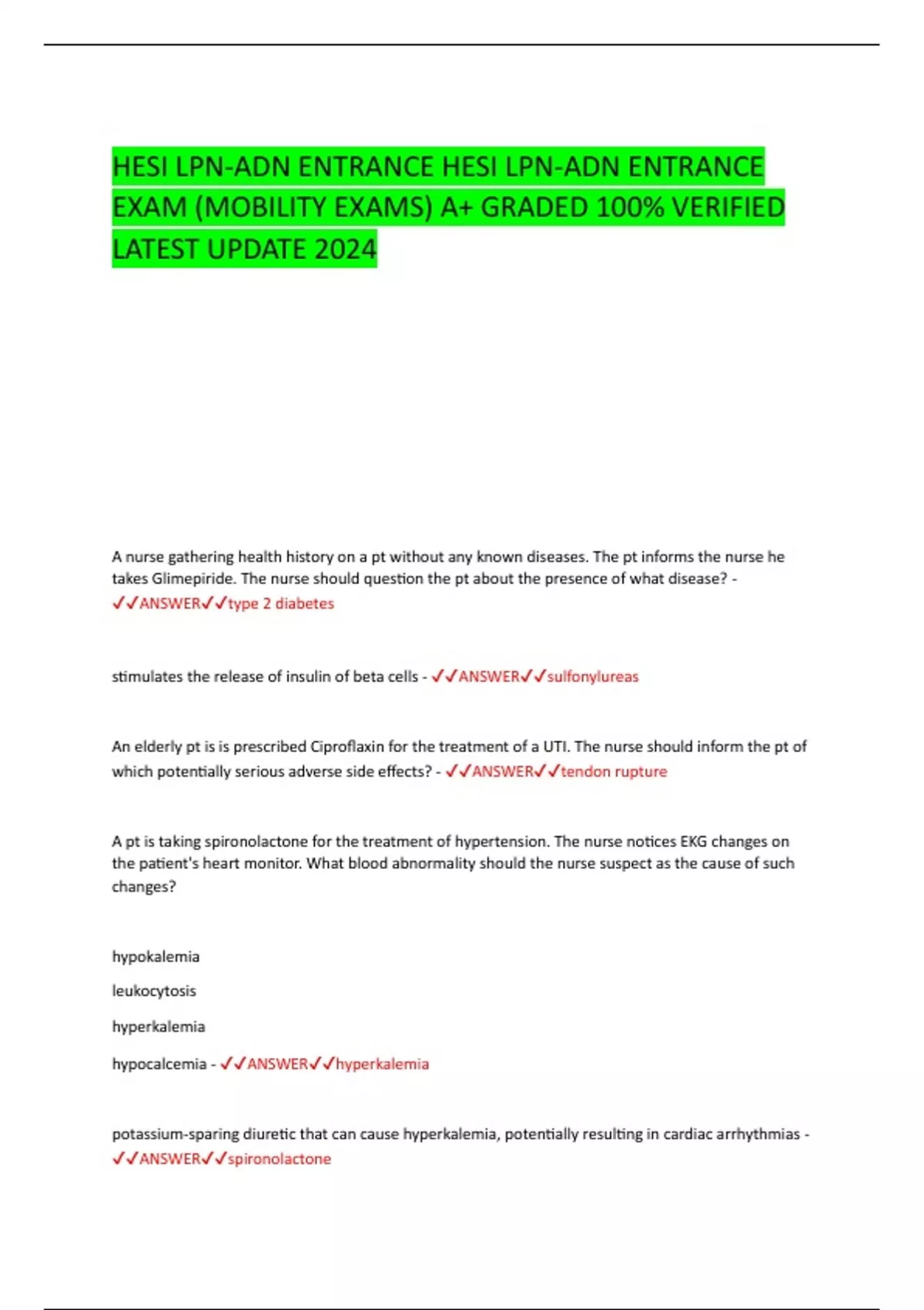 HESI LPN-ADN ENTRANCE HESI LPN-ADN ENTRANCE EXAM (MOBILITY EXAMS) A+ GRADED 100% VERIFIED LATEST UPDATE 2024 A nurse gathering health history on a pt without any known diseases. The pt informs the nurse he takes Glimepiride. The nurse should question the pt about the presence of what disease? - ANSWERtype 2 diabetes stimulates the release of insulin of beta cells - ANSWERsulfonylureas