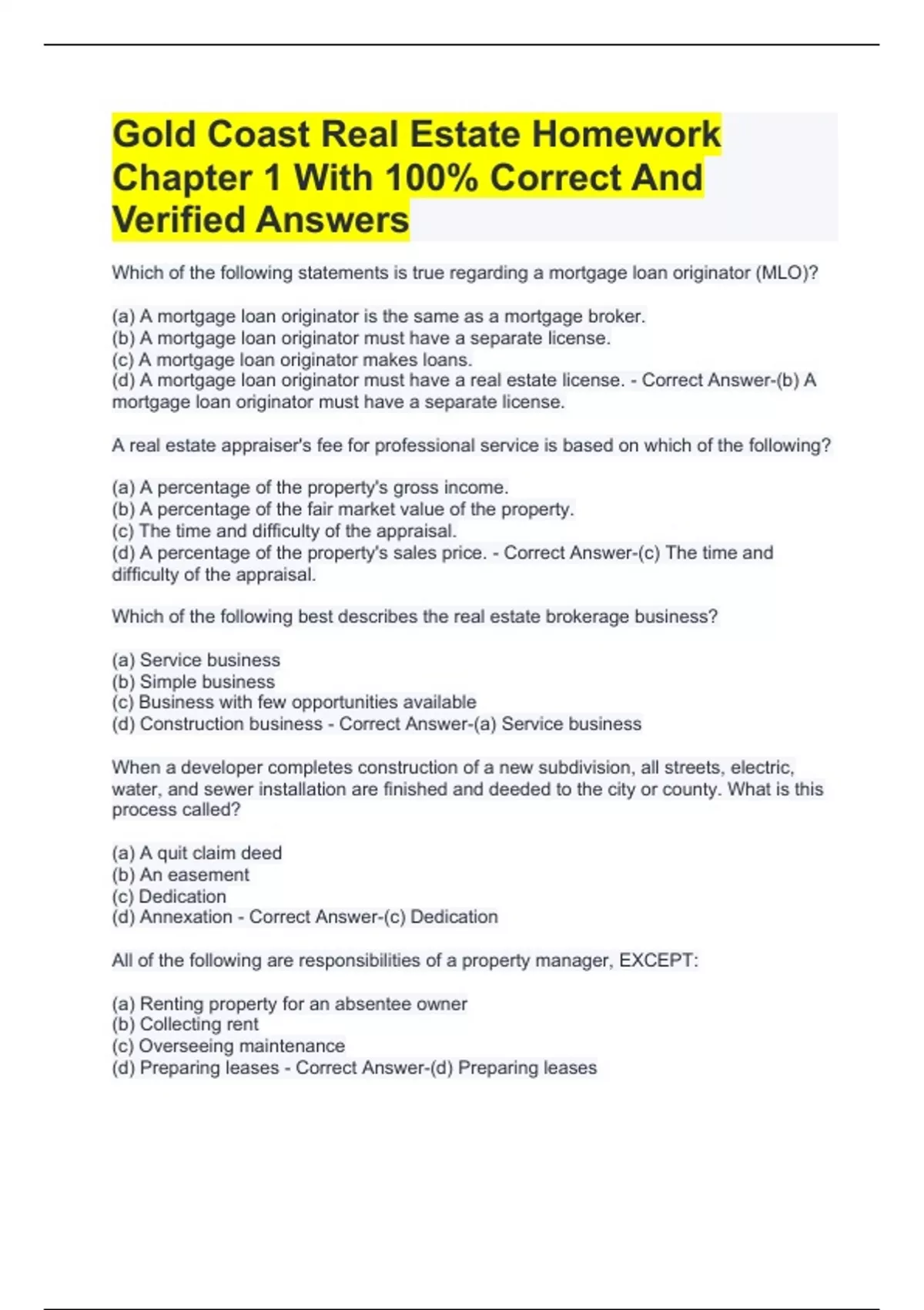 Gold Coast Real Estate Homework Chapter 1 With 100% Correct And Verified Answers