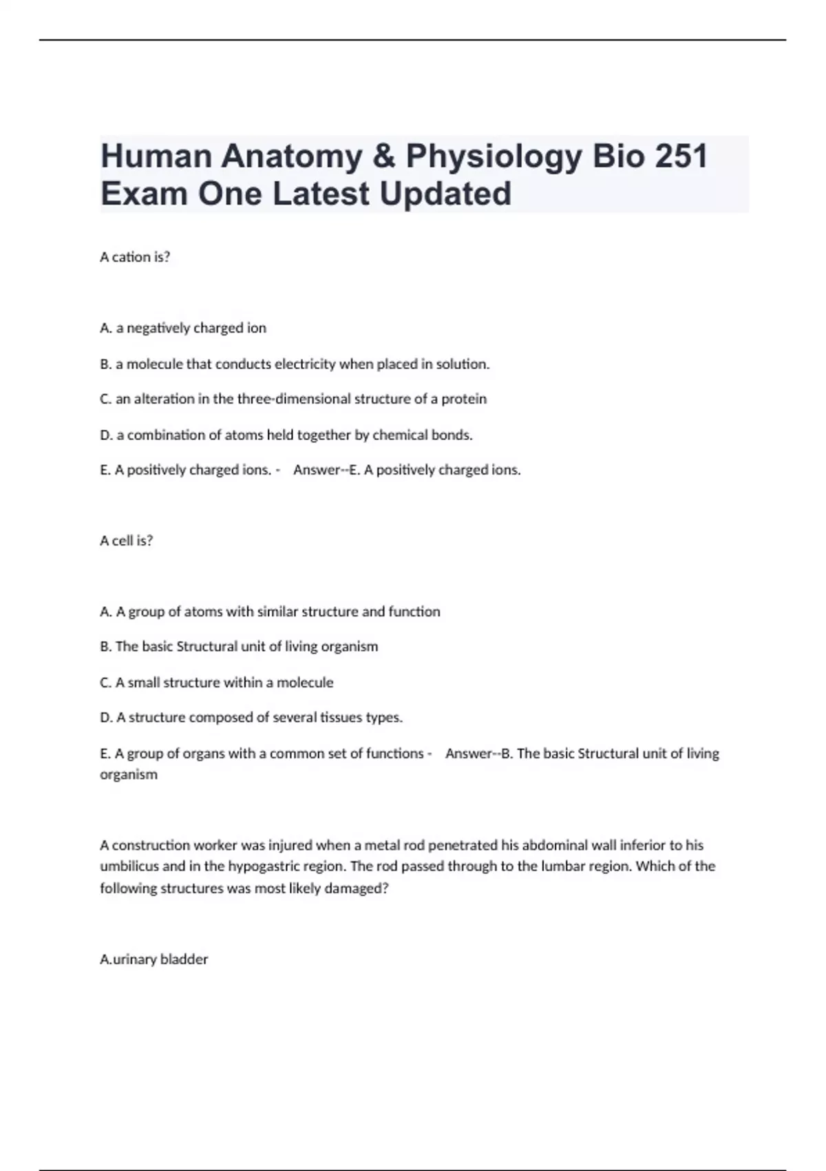 Human Anatomy & Physiology Bio 251 Exam One Latest Updated