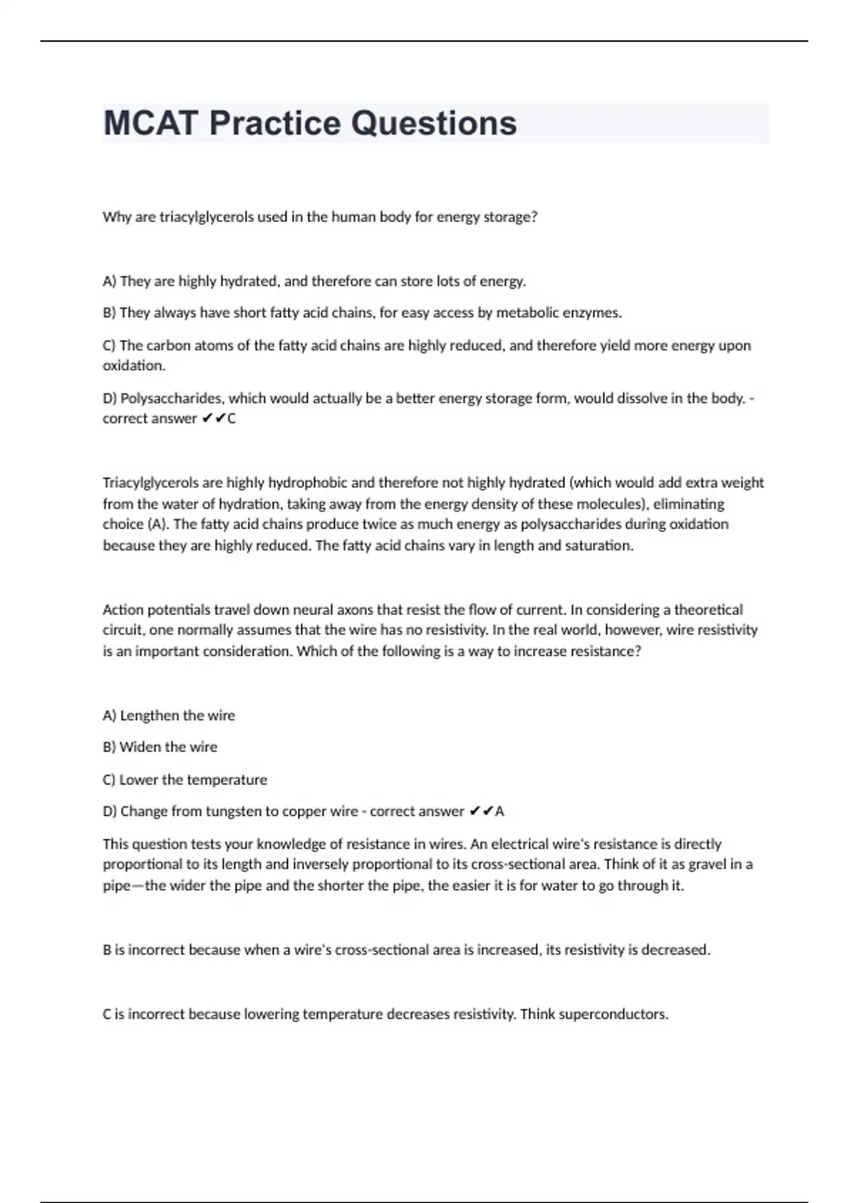 MCAT Practice Questions Why are triacylglycerols used in the human body for energy storage? A) They are highly hydrated, and therefore can store lots of energy. B) They always have short fatty acid chains, for easy access by metabolic enzymes. C) The carbon atoms of the fatty acid chains are highly reduced, and therefore yield more energy upon oxidation. D) Polysaccharides, which would actually be a better energy storage form, would dissolve in the body. - correct answer C Triacylglycerols are highly hydrophobic and therefore not highly hydrated (which would add extra weight from the water of hydration, taking away from the energy density of these molecules), eliminating choice (A). The fatty acid chains produce twice as much energy as polysaccharides during oxidation because they are highly reduced. The fatty acid chains vary in length and saturation. Action potentials travel down neural axons that resist the flow of current. In considering a theoretical circuit, one normally assumes that the wire has no resistivity. In the real world, however, wire resistivity is an important consideration. Which of the following is a way to increase resistance? A) Lengthen the wire B) Widen the wire