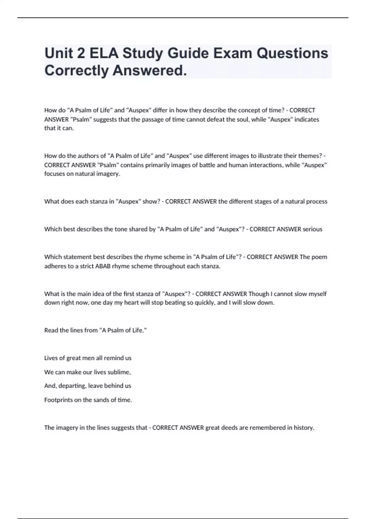 Unit 2 ELA Study Guide Exam Questions Correctly Answered. How do "A Psalm of Life" and "Auspex" differ in how they describe the concept of time? - CORRECT ANSWER "Psalm" suggests that the passage of time cannot defeat the soul, while "Auspex" indicates that it can. How do the authors of "A Psalm of Life" and "Auspex" use different images to illustrate their themes? - CORRECT ANSWER "Psalm" contains primarily images of battle and human interactions, while "Auspex" focuses on natural imagery. What does each stanza in "Auspex" show? - CORRECT ANSWER the different stages of a natural process Which best describes the tone shared by "A Psalm of Life" and "Auspex"? - CORRECT ANSWER serious Which statement best describes the rhyme scheme in "A Psalm of Life"? - CORRECT ANSWER The poem adheres to a strict ABAB rhyme scheme throughout each stanza. What is the main idea of the first stanza of "Auspex"? - CORRECT ANSWER Though I cannot slow myself down right now, one day my heart will stop beating so quickly, and I will slow down. Read the lines from "A Psalm of Life." Lives of great men all remind us We can make our lives sublime, And, departing, leave behind us Footprints on the sands of time. The imagery in the lines suggests that - CORRECT ANSWER great deeds are remembered in history.