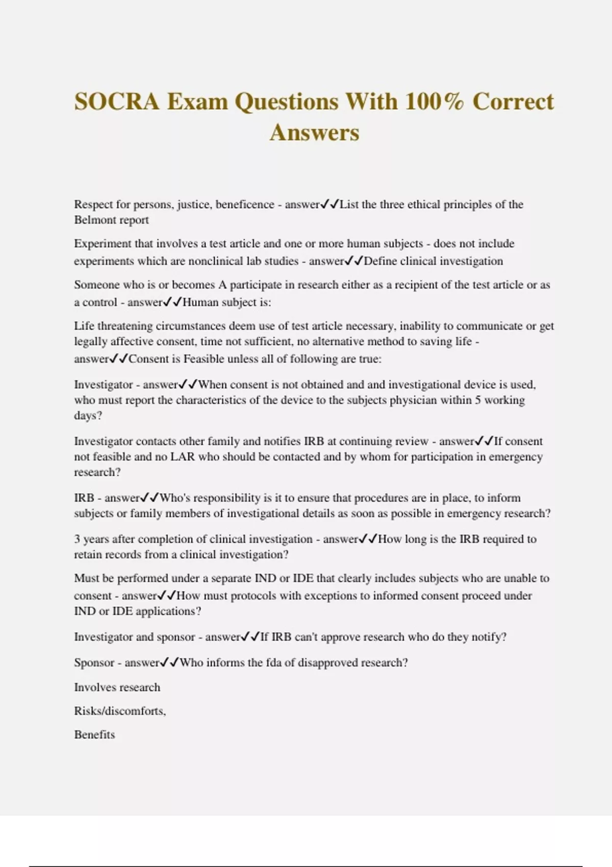 SOCRA Exam Questions With 100% Correct Answers Respect for persons, justice, beneficence - answerList the three ethical principles of the Belmont report Experiment that involves a test article and one or more human subjects - does not include experiments which are nonclinical lab studies - answerDefine clinical investigation Someone who is or becomes A participate in research either as a recipient of the test article or as a control - answerHuman subject is: Life threatening circumstances deem use of test article necessary, inability to communicate or get legally affective consent, time not sufficient, no alternative method to saving life - answerConsent is Feasible unless all of following are true: Investigator - answerWhen consent is not obtained and and investigational device is used, who must report the characteristics of the device to the subjects physician within 5 working days? Investigator contacts other family and notifies IRB at continuing review - answerIf consent not feasible and no LAR who should be contacted and by whom for participation in emergency research? IRB - answerWho's responsibility is it to ensure that procedures are in place, to inform subjects or family members of investigational details as soon as possible in emergency research? 3 years after completion of clinical investigation - answerHow long is the IRB required to retain records from a clinical investigation? Must be performed under a separate IND or IDE that clearly includes subjects who are unable to consent - answerHow must protocols with exceptions to informed consent proceed under IND or IDE applications? Investigator and sponsor - answerIf IRB can't approve research who do they notify? Sponsor - answerWho informs the fda of disapproved research? Involves research Risks/discomforts, Benefits Alternates to participation Confidentiality Compensation Contact info Injury Voluntary - answerBasic required elements of informed consent Some risks are unknown Termination by PI Additional costs Consequences of withdraw New info provided Approx number of subjects - answerAdditional elements of informed consent Within five working days - answerTimeframe after consent is waived to notify IRB and physicians Short form stating that consent has been presented orally IRB approved written summary of what is said to subject Copies of each signed are given to subject - answerShort form consent documents Short form written consent doc- subject, and witness Copy of summary- signed by witness and consent authorized - answerWho signs what in the short form consent process? True - answerTrue or false- drugs intended solely for tests in vitro or in lab research animals, or placebos are exempt from cfr 312.160 A person that assumes as an independent contractor with the sponsor one or more of the obligations of a sponsor for example design of a protocol, selection or monitoring of investigations, evaluation of reports, in preparation of materials to be submitted to the FDA - answerContract research organization (cro) Sponsor must: