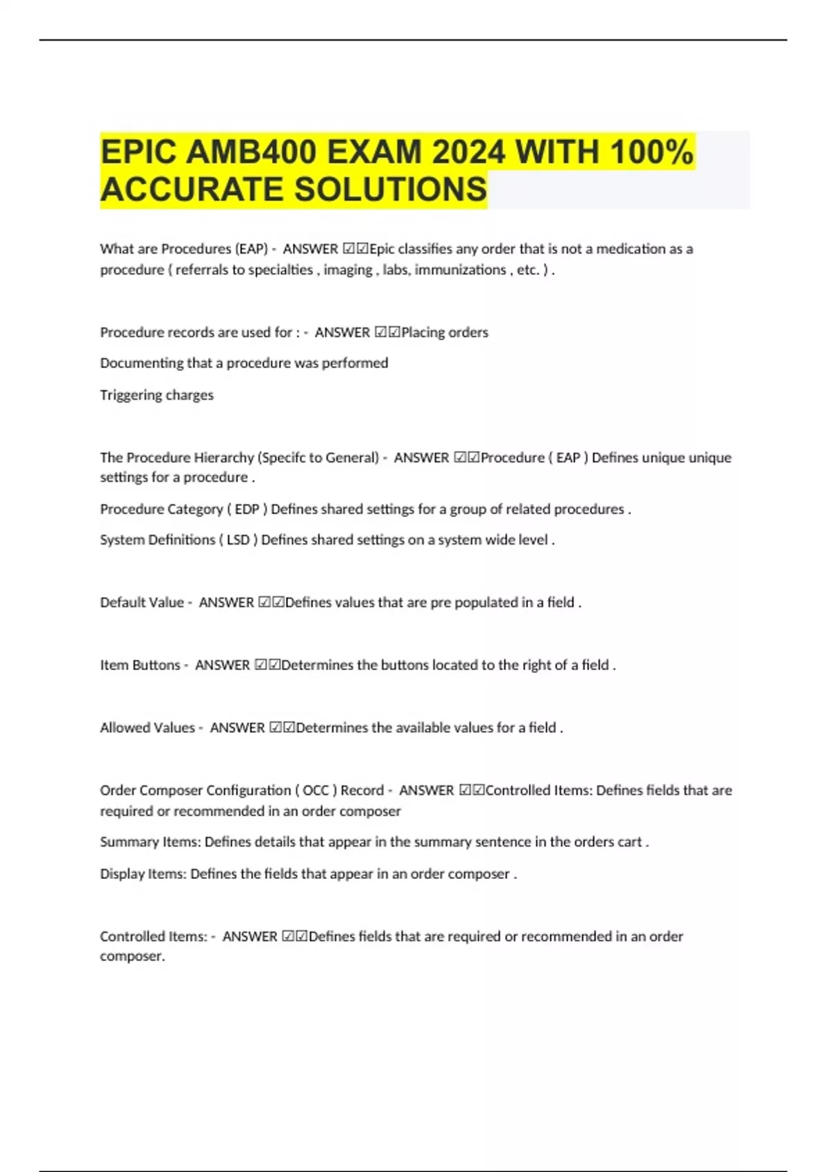EPIC AMB400 EXAM 2024 WITH 100% ACCURATE SOLUTIONS What are Procedures (EAP) - ANSWER ☑☑Epic classifies any order that is not a medication as a procedure ( referrals to specialties , imaging , labs, immunizations , etc. ) . Procedure records are used for : - ANSWER ☑☑Placing orders Documenting that a procedure was performed Triggering charges The Procedure Hierarchy (Specifc to General) - ANSWER ☑☑Procedure ( EAP ) Defines unique unique settings for a procedure . Procedure Category ( EDP ) Defines shared settings for a group of related procedures . Syst