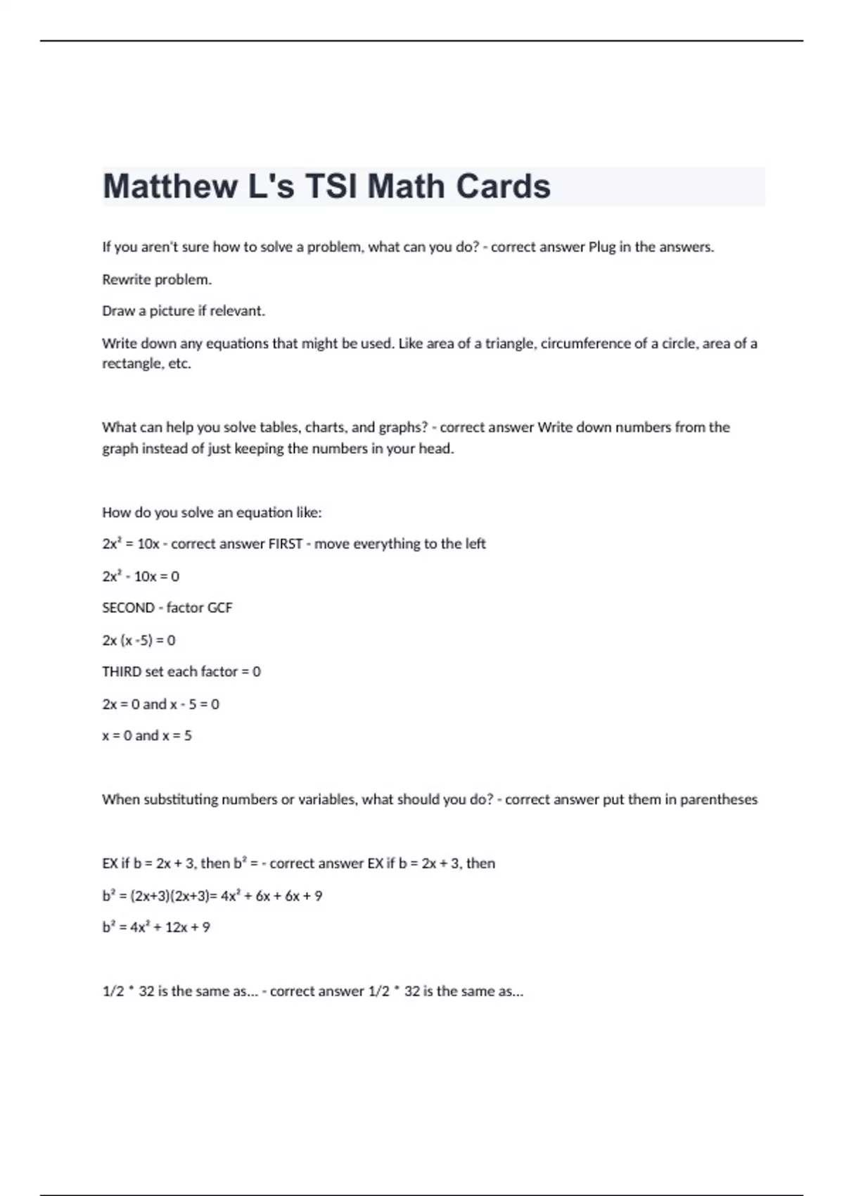 If you aren't sure how to solve a problem, what can you do? - correct answer Plug in the answers. Rewrite problem. Draw a picture if relevant. Write down any equations that might be used. Like area of a triangle, circumference of a circle, area of a rectangle, etc. What can help you solve tables, charts, and graphs? - correct answer Write down numbers from the graph instead of just keeping the numbers in your head. How do you solve an equation like: 2x² = 10x - correct answer FIRST - move everything to the left 2x² - 10x = 0 SECOND - factor GCF 2x (x -5) = 0 THIRD set each factor = 0 2x = 0 and x - 5 = 0 x = 0 and x = 5 When substituting numbers or variables, what should you do? - correct answer put them in parentheses EX if b = 2x + 3, then b² = - correct answer EX if b = 2x + 3, then b² = (2x+3)(2x+3)= 4x² + 6x + 6x + 9 b² = 4x² + 12x + 9 1/2 * 32 is the same as... - correct answer 1/2 * 32 is the same as... dividing 32 by 2