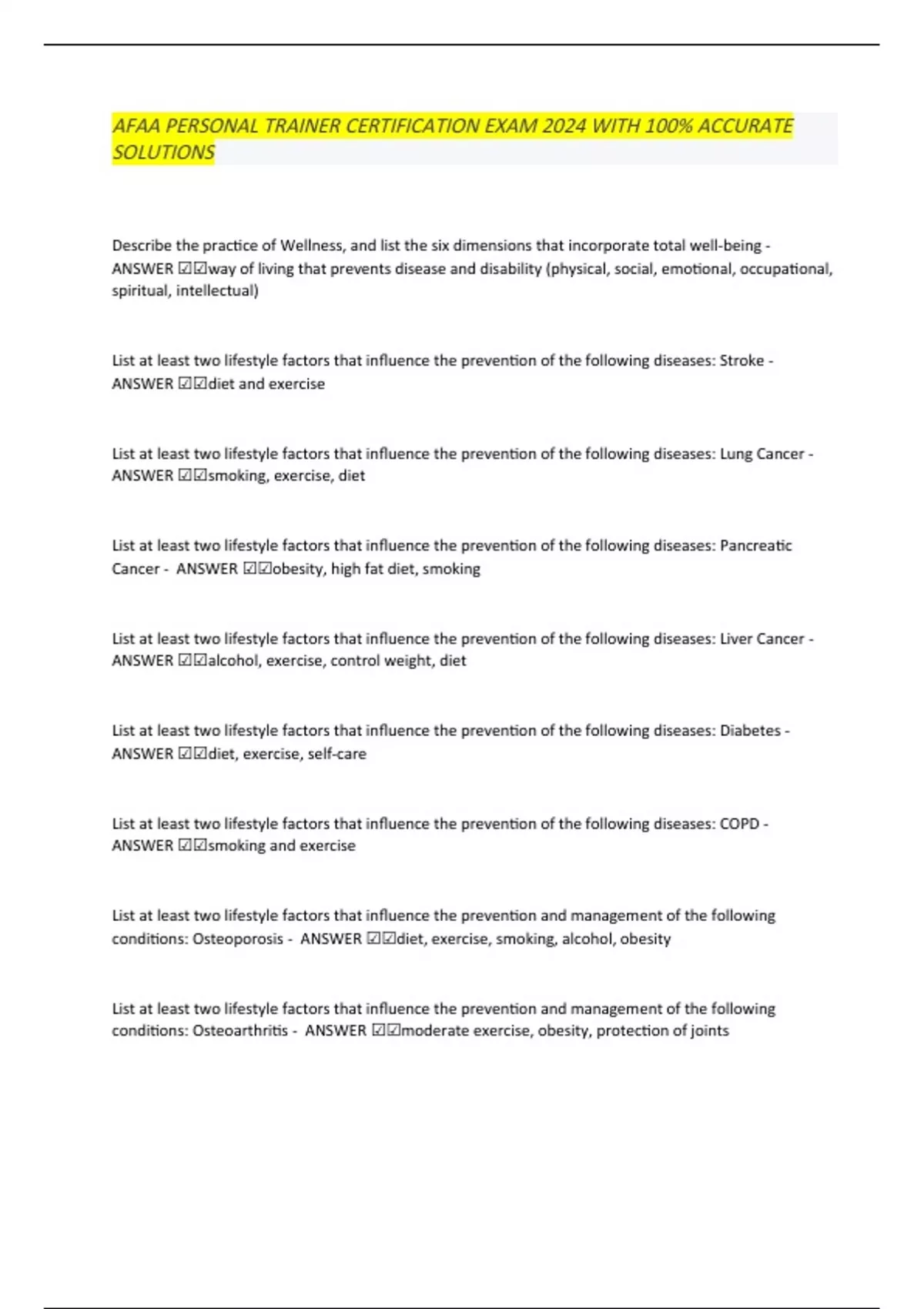 AFAA PERSONAL TRAINER CERTIFICATION EXAM 2024 WITH 100% ACCURATE SOLUTIONS Describe the practice of Wellness, and list the six dimensions that incorporate total well-being - ANSWER ☑☑way of living that prevents disease and disability (physical, social, emotional, occupational, spiritual, intellectual) List at least two lifestyle factors that influence the prevention of the following diseases: Stroke - ANSWER ☑☑diet and exercise List at least two lifestyle factors that influence the prevention of the following diseases: Lung Cancer - AN