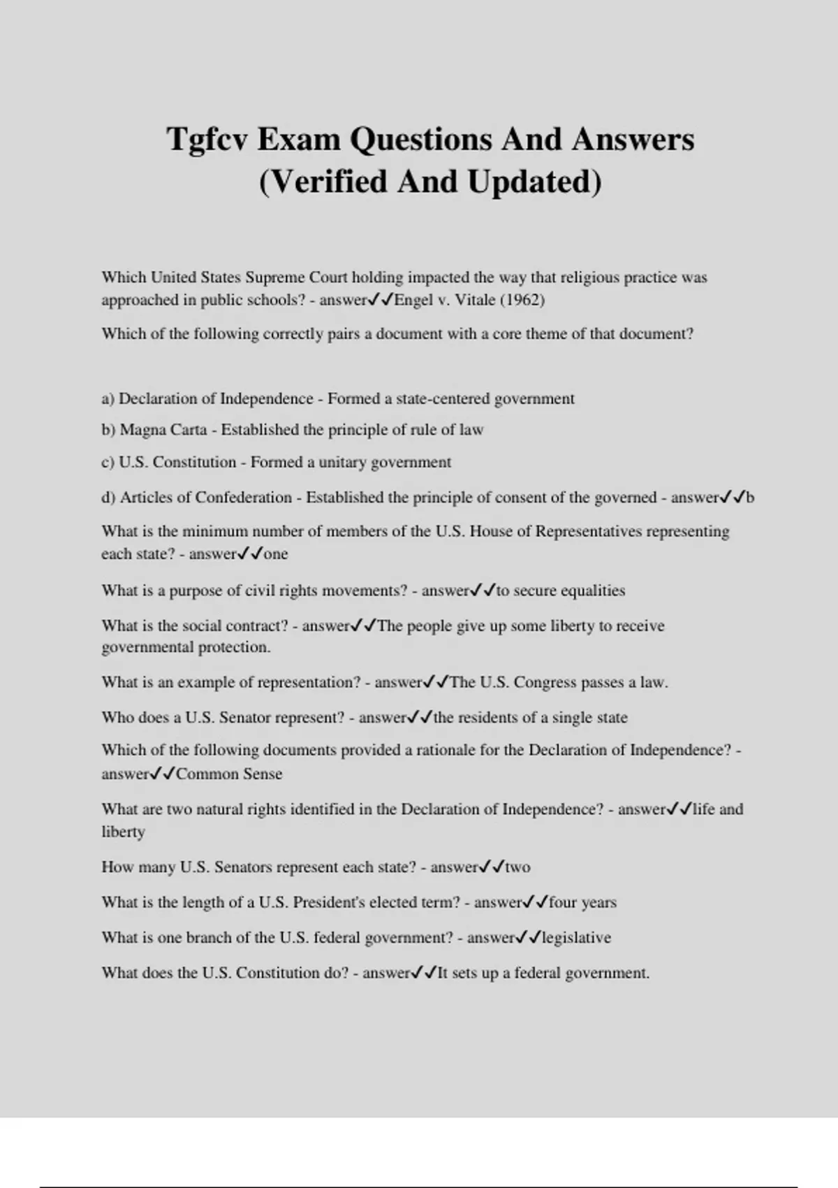 Tgfcv Exam Questions And Answers (Verified And Updated) Which United States Supreme Court holding impacted the way that religious practice was approached in public schools? - answerEngel v. Vitale (1962) Which of the following correctly pairs a document with a core theme of that document? a) Declaration of Independence - Formed a state-centered government b) Magna Carta - Established the principle of rule of law c) U.S. Constitution - Formed a unitary government d) Articles of Confederation - Established the principle of consent of the governed - answerb What is the minimum number of members of the U.S. House of Representatives representing each state? - answerone What is a purpose of civil rights movements? - answerto secure equalities What is the social contract? - answerThe people give up some liberty to receive governmental protection. What is an example of representation? - answerThe U.S. Congress passes a law. Who does a U.S. Senator represent? - answerthe residents of a single state Which of the following documents provided a rationale for the Declaration of Independence? - answerCommon Sense What are two natural rights identified in the Declaration of Independence? - answerlife and liberty How many U.S. Senators represent each state? - answertwo What is the length of a U.S. President's elected term? - answerfour years What is one branch of the U.S. federal government? - answerlegislative What does the U.S. Constitution do? - answerIt sets up a federal government. Which phrase from a letter written by Abigail Adams to her husband John Adams in 1776 is reflected in the Nineteenth Amendment? - answer"I desire you would Remember the Ladies, and be more generous and favourable to them" Which phrase from a letter written by President Thomas Jefferson in 1802 reflects a freedom in the Bill of Rights? - answer"building a wall of separation between Church & State" Which of the following pairs of cases focused on the rights of public school students? - answerTinker v. Des Moines (1969) and Hazelwood v. Kuhlmeier (1988) Who is in charge of the executive branch? - answerthe President What is due process? - answerfair treatment in judicial proceedings Which of the following represents the principle of consent of the governed? - answerIndividuals elect members of the House of Representatives. What is an example of a power reserved to the states? - answercreating school systems Which statement from the English Bill of Rights is reflected in the U.S. Constitution's Eighth Amendment? - answer"That excessive bail ought not to be required . . . nor cruel and unusual punishments inflicted;" According to the authors of the Declaration of Independence, who is responsible for protecting natural rights? - answerthe government Who signs proposed bills into federal laws? - answerthe President of the United States How many amendments does the U.S. Constitution currently have? - answer27 What is an example of a democratic process? - answerThe people elect a Governor. Which phrase from the English Bill of Rights (1689) is reflected in the U.S. Constitution's Third Amendment? - answer"That . . . keeping a standing army within the kingdom in time of peace . . . is against law" Which scenario represents a violation of the Equal Protection Clause? - answerA state law establishes a higher minimum wage for men than for women. Which action is an example of petitioning the government? - answerlobbying officials What are the first two paragraphs of the Declaration of Independence called? - answerthe Preamble Which part of government was created to reflect the colonists' position that governments derive their powers from the consent of the governed? - answerthe legislature