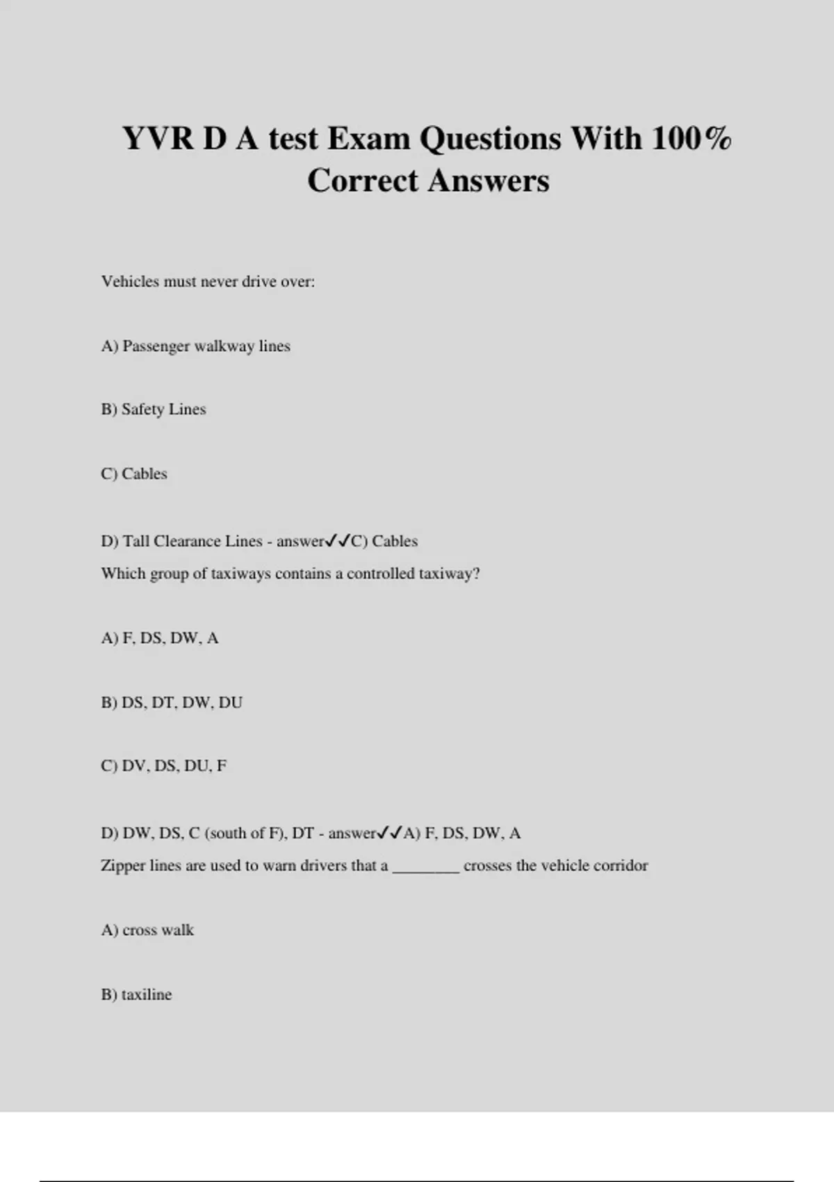 YVR D A test Exam Questions With 100% Correct Answers Vehicles must never drive over: A) Passenger walkway lines B) Safety Lines C) Cables D) Tall Clearance Lines - answerC) Cables Which group of taxiways contains a controlled taxiway? A) F, DS, DW, A B) DS, DT, DW, DU C) DV, DS, DU, F D) DW, DS, C (south of F), DT - answerA) F, DS, DW, A Zipper lines are used to warn drivers that a ________ crosses the vehicle corridor A) cross walk B) taxiline C) runaway D) jet bridge - answerB) Taxiline Are helipads like runways? A) Yes, helipads are like runways and are controlled surfaces with hold lines B) No, you can go on a helipad if a helicopter is not around C) They are controlled, but are not like runways and don't have hold lines D) Helipads are uncontrolled - answerA) Yes, helipads are like runways and are controlled surfaces with hold lines All spills must be reported to Airport Operations at: A) B) 0 C) 911 D) - answerD) 26R M7 sign indicates: A) Taxiway Location Sign B) Taxiway Directional Sign