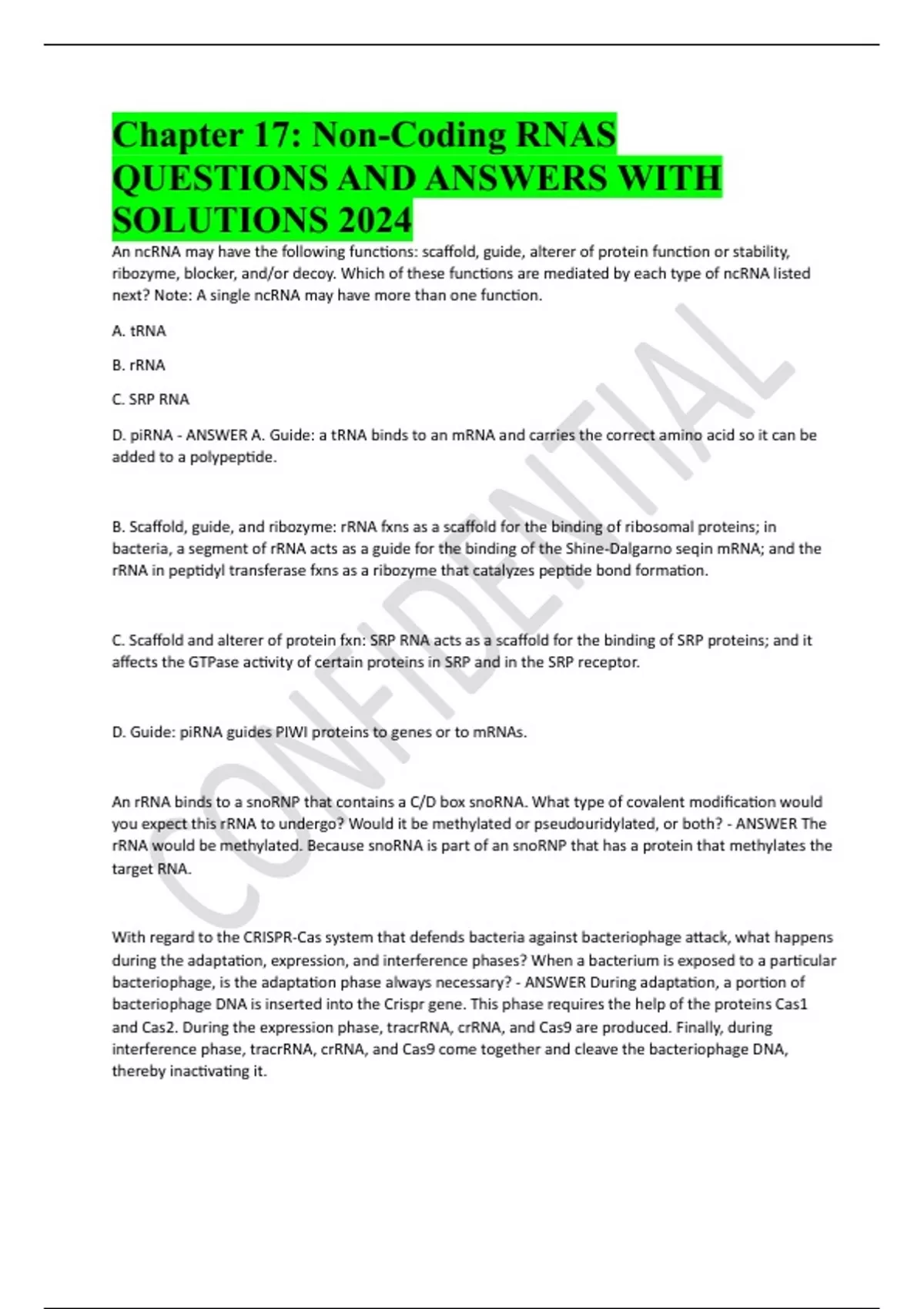 Chapter 17: Non-Coding RNAS QUESTIONS AND ANSWERS WITH SOLUTIONS 2024