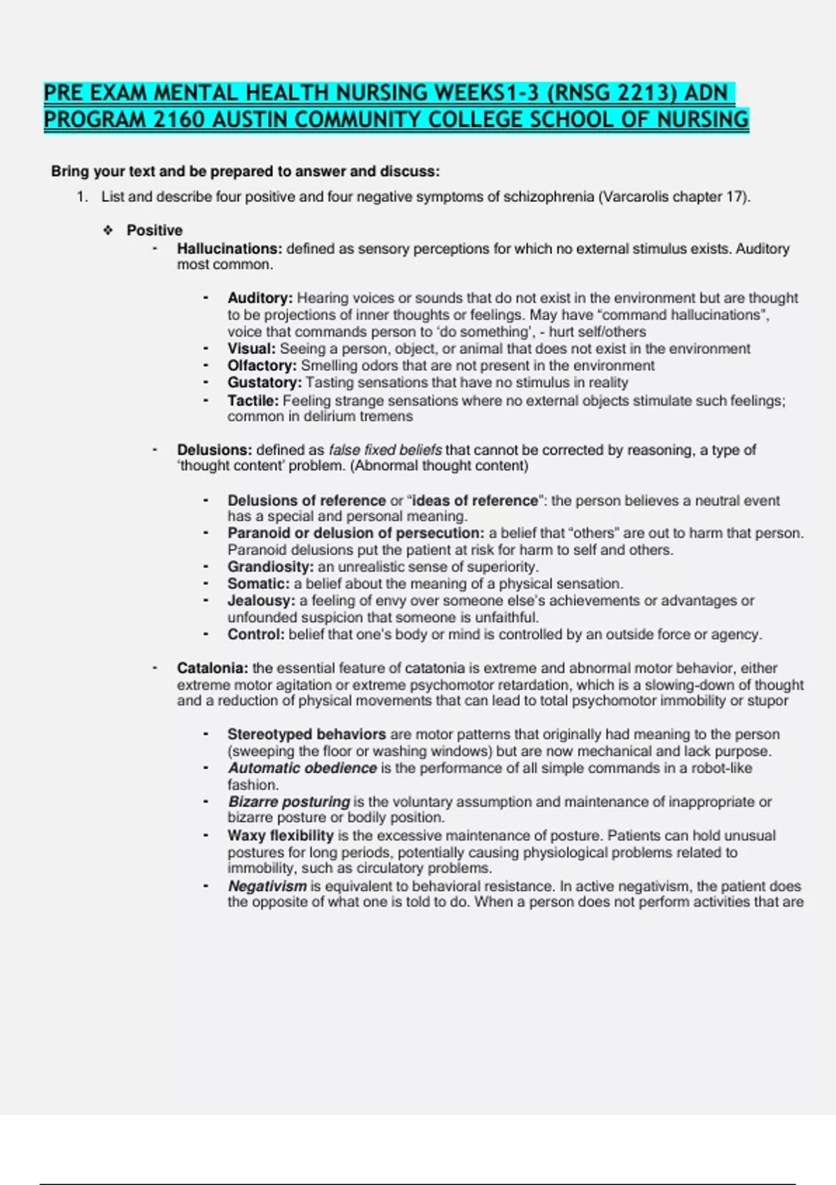 PRE EXAM MENTAL HEALTH NURSING WEEKS1-3 (RNSG 2213) ADN PROGRAM 2160 AUSTIN COMMUNITY COLLEGE SCHOOL OF NURSING