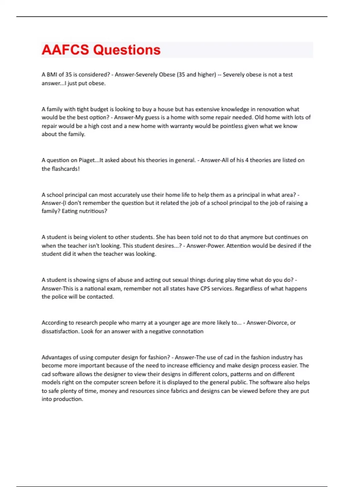 A BMI of 35 is considered? - Answer-Severely Obese (35 and higher) -- Severely obese is not a test answer...I just put obese. A family with tight budget is looking to buy a house but has extensive knowledge in renovation what would be the best option? - Answer-My guess is a home with some repair needed. Old home with lots of repair would be a high cost and a new home with warranty would be pointless given what we know about the family. A question on Piaget...It asked about his theories in general. - Answer-All of his 4 theories are listed on the flashcards! A school principal can most accurately use their home life to help them as a principal in what area? - Answer-(I don't remember the question but it related the job of a school principal to the job of raising a family? Eating nutritious? A student is being violent to other students. She has been told not to do that anymore but continues on when the teacher isn't looking. This student desires...? - Answer-Power. Attention would be desired if the student did it when the teacher was looking. A student is showing signs of abuse and acting out sexual things during play time what do you do? - Answer-This is a national exam, remember not all states have CPS services. Regardless of what happens the police will be contacted. According to research people who marry at a younger age are more likely to... - Answer-Divorce, or dissatisfaction. Look for an answer with a negative connotation Advantages of using computer design for fashion? - Answer-The use of cad in the fashion industry has become more important because of the need to increase efficiency and make design process easier. The cad software allows the designer to view their designs in different colors, patterns and on different models right on the computer screen before it is displayed to the general public. The software also helps to safe plenty of time, money and resources since fabrics and designs can be viewed before they are put into production.All of the following guarantee $ back except: cashier check/personal check/travelers check/certified check - Answer-Personal Checks An FCS teacher is trying to promote her program by planning an event that includes the students and gets word out to the community what would be the best event to get the information out? (with limited budget)Catered meal? Car wash? Sponsoring elementary event? - Answer-Sponsoring an elementary event would be the most cost efficient, this would only require providing volunteers to help with the already planned event. Best form of clothes for an overweight old adult with osteoporosis and shoulder problems - AnswerVelcro, large buttons, and skirt, front zipper Best way to reserve nutrients? boiling/sautéing/deep frying/steaming - Answer-Sautéing Branding laws for clothing - Answer-The U.S. Customs and Border Protection (CBP) and the Federal Trade Commission (FTC) enforce labeling laws and acts in the United States. In general textile and apparel products sold in the United States must be labeled with the following information: the fiber content, the country of origin, the manufacturer or dealer identity, and the care instructions Care handling labels laws - Answer-Symbols for clothing care is universal. All clothes MUST have a permanently attached care directions. Cereal that is more refined will last longer on the shelf because... - Answer-Refined grains are mainly composed of only the endosperm portion of the grain. The milling process removes most of the bran and some germ, along with the majority of fiber, vitamins, minerals, antioxidants and phytochemicals. As much as 75% of phytochemicals (phytonutrients) are lost in the refining process. Condos... How does ownership work...? - Answer-Condo dwellers own their portion of space being occupied. Each condo owner pays a monthly fee to maintain the common areas. Everyone in the condominium helps to maintain the commons and keep it nice. ** This answer is discussed in more detail on the FCS flashcards! Correct serving size for cooked fruits and vegetables? - Answer-1⁄2 cupDeep red color of meat is from: - Answer-Myoglobin -- the more red the meat is, the more myoglobin is present Europe health policies compared to America - Answer-Europe is Social welfare - high taxes to pay for others costs. Believe childbearing is social aspect Family with good health and no kids should get what type of insurance? - Answer-Catastrophic For efficiency which would be the best way to allow lighting into a house? - Answer-With large windows facing to allow winter sun's heat into house. How do the family leave policies compare in Europe to the U.S.? - Answer-U.S. did not mandate leave until 1993 with the Family and Medical Leave Act (FMLA) How has the amount of money people have put in their savings account changed over the last 50 years? - Answer-Depends on economy?? (not really sure) How has the internet changed consumer's decision making process? - Answer-make more educated decisions -- ability to research more and look for best prices and reviews. In order to cut back costs what type of home improvement is best... - Answer-Replace weather strips/window seals In order to make a small room appear larger how should the furniture be organized? - Answer-Seeing the floor makes room appear larger, light, cool colors make open, monochromatic color scheme, let in light. Smaller furniture. Milk is a common allergy? - Answer-It is estimated that 80% to 90% of egg, milk, wheat, and soy allergies go away by age 5 years. Some allergies are more persistent. For example, 1 in 5 young children will outgrow a peanut allergy and fewer will outgrow allergies to nuts or seafood. Peanuts, nuts, and seafood are the most common causes of severe reactions.Most U.S. and Europe policies differ - Answer-because of different beliefs and areas of success. US has not had a war within its borders like Europe has. Different requirements different standards. Nutrition label changes in the 1990s - Answer-ingredien