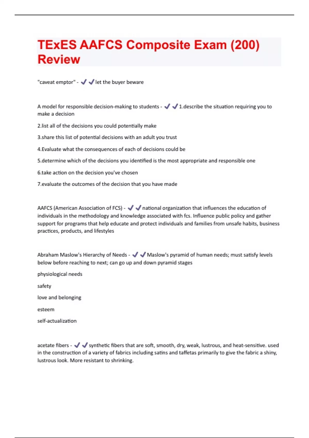 "caveat emptor" - let the buyer beware A model for responsible decision-making to students - ibe the situation requiring you to make a decision all of the decisions you could potentially make this list of potential decisions with an adult you trust 4.Evaluate what the consequences of each of decisions could be mine which of the decisions you identified is the most appropriate and responsible one action on the decision you've chosen ate the outcomes of the decision that you have made AAFCS (American Association of FCS) - national organization that influences the education of individuals in the methodology and knowledge associated with fcs. Influence public policy and gather support for programs that help educate and protect individuals and families from unsafe habits, business practices, products, and lifestyles Abraham Maslow's Hierarchy of Needs - Maslow's pyramid of human needs; must satisfy levels below before reaching to next; can go up and down pyramid stages physiological needs safety love and belonging esteem self-actualization acetate fibers - synthetic fibers that are soft, smooth, dry, weak, lustrous, and heat-sensitive. used in the construction of a variety of fabrics including satins and taffetas primarily to give the fabric a shiny, lustrous look. More resistant to ic fibers - synthetic fibers that are soft, lightweight, resilient, and heat-sensitive. Often used as a replacement for wool because they have a very similar feel. Less expensive alternative to cashmere bc very similar appearance. adolescence (5, EE) - 11-18; identity vs. role confusion; attempts to find place in society and identify future goals and the skills and values necessary to achieve those goals; becomes concerned with perceptions; if unable to determine future goals can lead to confusion about what roles the child will play when he or she reaches adulthood Affective communication - Communication in which an individual demonstrates his or her feelings through facial expressions, motions, gestures, or by outright stating their feelings affective skill - How effectively an individual can recognize, understand and handle emotions and relationships. Allows an individual to feel appropriate emotion in response to certain situations or stimuli. Americans with Disabilities Act (ADA) - requires public facilities be accessible fully to disabled persons anorexia - eating disorder in which an individ views his or her own body as being overweight, even though not, which causes to have extreme, unfounded fear of gaining additional weight asymmetrical balance - both sides are not physically identical, but are similar enough that an individual believes that both sides seem to have the same "weight
