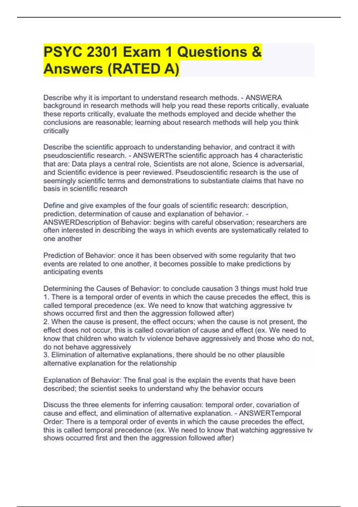PSYC 2301 Exam 1 Questions & Answers (RATED A)PSYC 2301 Exam 1 Questions & Answers (RATED A)PSYC 2301 Exam 1 Questions & Answers (RATED A)PSYC 2301 Exam 1 Questions & Answers (RATED A)PSYC 2301 Exam 1 Questions & Answers (RATED A)Describe why it is important to understand research methods. - ANSWERA background in research methods will help you read these reports critically, evaluate these reports critically, evaluate the methods employed and decide whether the conclusions are reasonable; learning about research methods will help you think critically Describe the scientific approach to understanding behavior, and contract it with pseudoscientific research. - ANSWERThe scientific approach has 4 characteristic that are: Data plays a central role, Scientists are not alone, Science is adversarial,