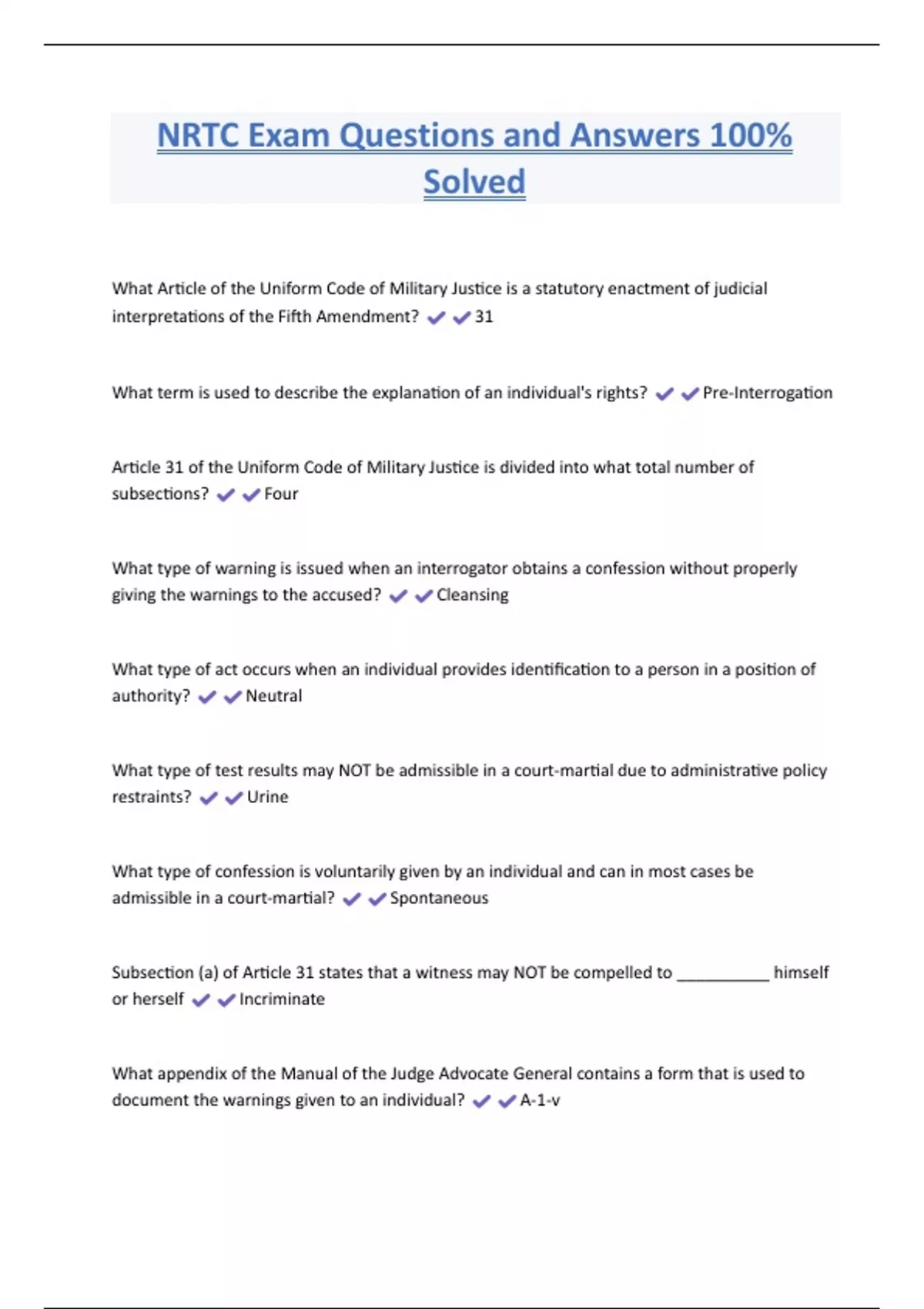NRTC Exam Questions and Answers 100% Solved What Article of the Uniform Code of Military Justice is a statutory enactment of judicial interpretations of the Fifth Amendment? 31 What term is used to describe the explanation of an individual's rights? Pre-Interrogation Article 31 of the Uniform Code of Military Justice is divided into what total number of subsections? Four What type of warning is issued when an interrogator obtains a confession without properly giving the warnings to the accused? Cleansing What type of act occurs when an individual provides identification to a person in a position of authority? Neutral What type of test results may NOT be admissible in a court-martial due to administrative policy restraints? Urine