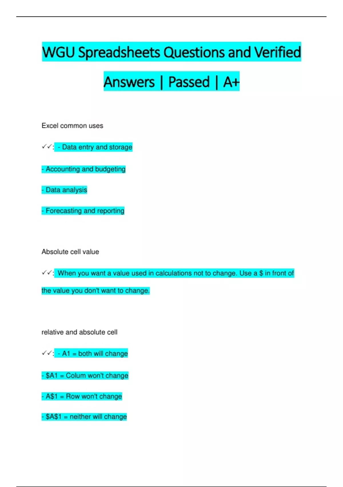 WGU Spreadsheets Questions and Verified Answers | Passed | A+