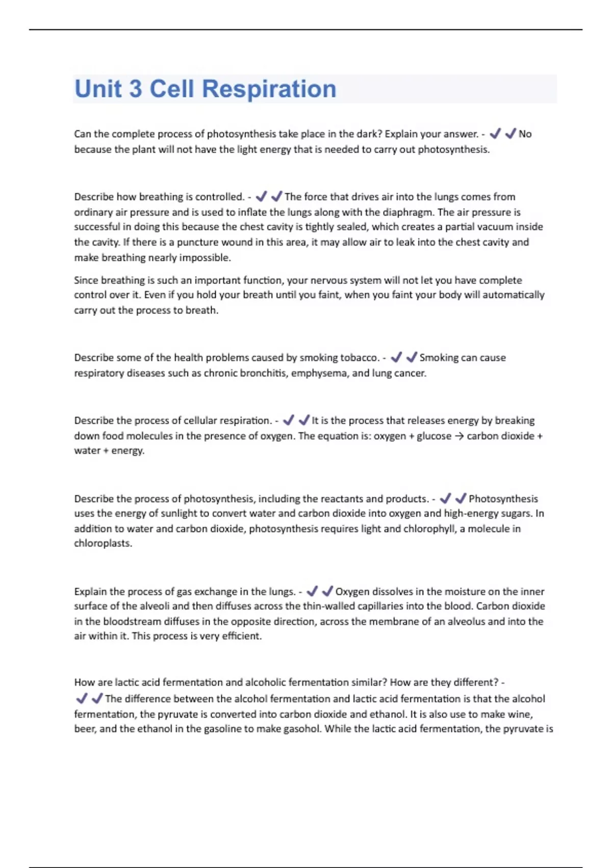 Unit 3 Cell Respiration Questions & Answers Already Passed!!