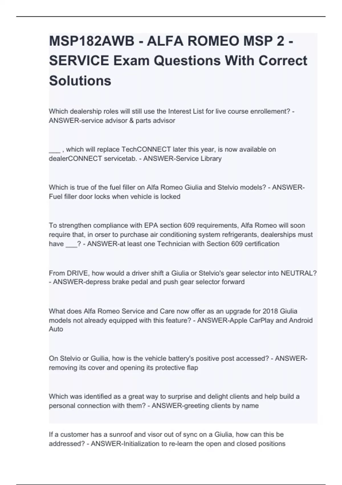 MSP182AWB - ALFA ROMEO MSP 2 - SERVICE Exam Questions With Correct Solutions