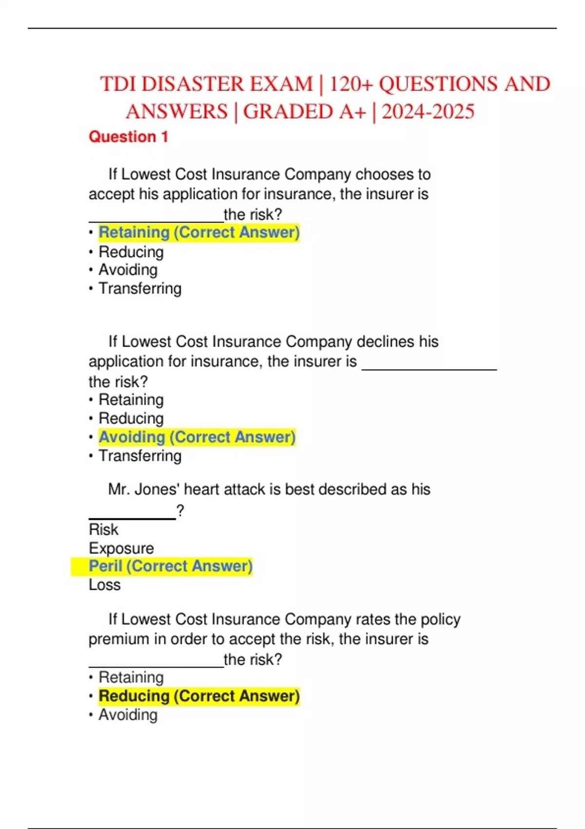 TDI DISASTER EXAM | 120+ QUESTIONS AND ANSWERS | GRADED A+ | Question 1 If Lowest Cost Insurance Company chooses to accept his application for insurance, the insurer is the risk? • Retaining (Correct Answer) • Reducing • Avoiding • Transferring If Lowest Cost Insurance Company declines his application for insurance, the insurer is the risk? • Retaining • Reducing • Avoiding (Correct Answer) • Transferring Mr. Jones' heart attack is best described as his ? Risk Exposure Peril (Correct Answer) Loss If Lowest Cost Insurance Company rates the policy premium in order to accept the risk, the insurer is the risk? • Retaining • Reducing (Correct Answer) • Avoiding • Transferring Question 2 When Mr. Ames policy is issued, who would be considered his ceding company or companies? • ABC Insurance Corp. • AIG • Allstate Insurance • ProActive Corp. (Correct Answer) All of the following Element of Insurable Risk are required by an insurer in order to issue a policy EXCEPT: • The loss must be uncertain in order for an insurer to accept a proposed risk. • Loss must be certain (Correct Answer) • Economic Hardship • Large number of homogenous units Correct If Mr. Ames (the insured) dies, which insurer will issue the check to his loved ones? ProActive Insurer Corp. (Correct Answer) ABC Insurance Corp. AIG Allstate Insurance There are different forms of Reinsuring Agreements between Insurers. ABC Insurance Corp. routinely handles potential risk and reinsures losses as they are accepted by ProActive Insurer Corp. Which form below best describes the reinsuring agreement in effect with ABC Insurance Corp? • Facultative Treaty (Correct Answer) Normal Ceding Question 3 The allows the insurer to predict their future losses in a particular group of policyholders. • Morbidity Table • Loss Ratio • Experience Rating • Law of Large Numbers (Correct Answer) Which of the following groups of people would be considered the best definition of Adverse Selection'? • A group of farmers. (Correct Answer) • A group of young interns • A group of secretaries • A group of college students Which of the following private insurers are considered 'PAR'? Stock Companies Mutual Companies (Correct Answer) Non-Profit Service Organizations Special Non-Profit Organizations Which of the following private insurers are considered NON-PAR'? • Stock Companies (Correct Answer) • Mutual Companies • Non-Profit Service Organizations • Special Non-Profit Organizations Question 4 The Airman's Lodge would be considered to be which type of an insurer? • Reciprocal Insurer • Risk Retention Group • Fraternal Association (Correct Answer) • Purchasing Group This insurer's price per thousand for life insurance for their members started at pennies per thousand. However, this year there were more losses than expected in their earlier planning years. Therefore this type of insurer is allowed (without permission or endorsement to the original policy) to read just their cost per thousand for life coverage and begin charging their members the new pricing immediately. Which type of private insurer best describes this insurer? • Reciprocal Insurer • Lloyd's of London • Fraternal Association (Correct Answer) • Purchasing Group This type insurer would insure Tom Brady's arm as a quarterback and his way of making a living? Reciprocal Insurer Risk Retention Group (Correct Answer) Fraternal Association Purchasing Group 4. This type insurer would provide for hole in one indemnity at a golfing tournament! Reciprocal Insurer Risk Retention Group (Correct Answer) Fraternal Association Purchasing Group Correct Question 5 Best Valued Insurance Company doing business in Atlanta, Georgia would be considered a/an Insurer. • Domestic • Foreign (Correct Answer) • Admitted • Alien Best Valued Insurance Company doing business in Europe would be considered a/an Insurer. • Domestic • Foreign • Admitted • Alien (Correct Answer) Best Valued Insurance Company doing business in Houston, Texas would be considered a/an Insurer. Domestic (Correct Answer) Foreign Admitted Alien 4. Best Valued Insurance Company doing business in Juarez, Mexico would be considered a/an Insurer. Domestic Foreign Admitted Alien (Correct Answer) Question 6 Joe represents six different insurance companies and is paid based on his earned commissions. He is the best example of a/an . • Independent (Correct Answer) • Captive/Exclusive • General Agent • Direct Writer Julie is a supervisor & manages several agents for ABC Insurance Corp. She cannot represent any other insurance carrier except for the one in which she represents now. She is the best example of a/an . • Independent • Captive/Exclusive • General Agent (Correct Answer) • Direct Writer Okay Insurance Corporation has received the strongest financial rating position. Choose which of the following would be the published rating position for public view? 100 A++ A+ Superior (Correct Answer) AAA Betsy Sue works in the bank offering their customers only credit life insurance on their new loans. She does not receive additional compensation if a customer purchases the insurance. She is the best example of a/an . • Independent • Captive/Exclusive • General Agent • Direct Writer (Correct Answer) Question 7 Mr. Jones choose to purchase travel accidental coverage to protect his loved ones for his flight to New York. Which type of Mass Marketing did he purchase? • Direct Response • Franchise Marketing • Non-Insurance Sponsors • Vending Machine (Correct Answer) Mr. Jones is a member of the Business Men Of Texas Association and purchases Life and Health coverage through the association. Which type of Mass Marketing did he purchase? • Direct Response • Franchise Marketing (Correct Answer) • Non-Insurance Sponsors • Vending Machine ABC Insurance Corp. conducts their advertising on television. Which form of mass marketing do they use? Direct R