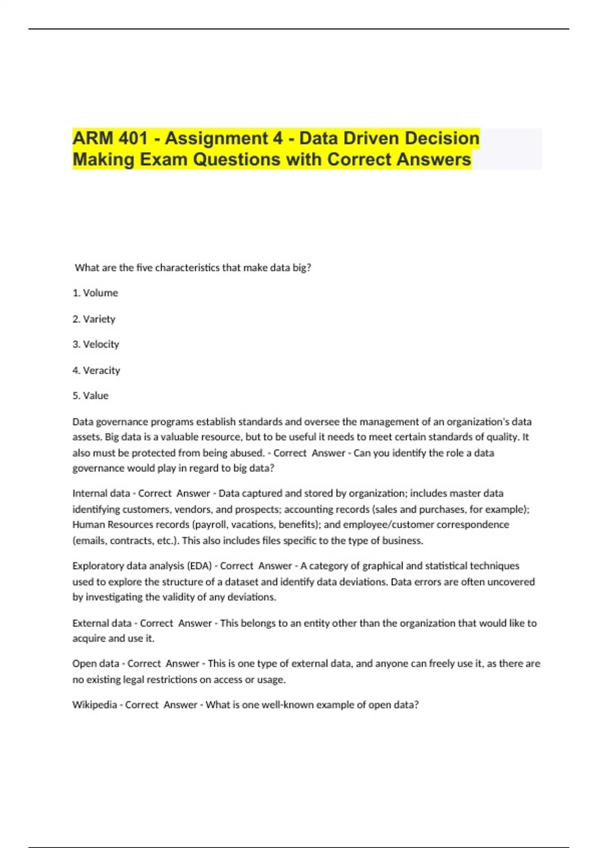 ARM 401 - Assignment 4 - Data Driven Decision Making Exam Questions with Correct Answers