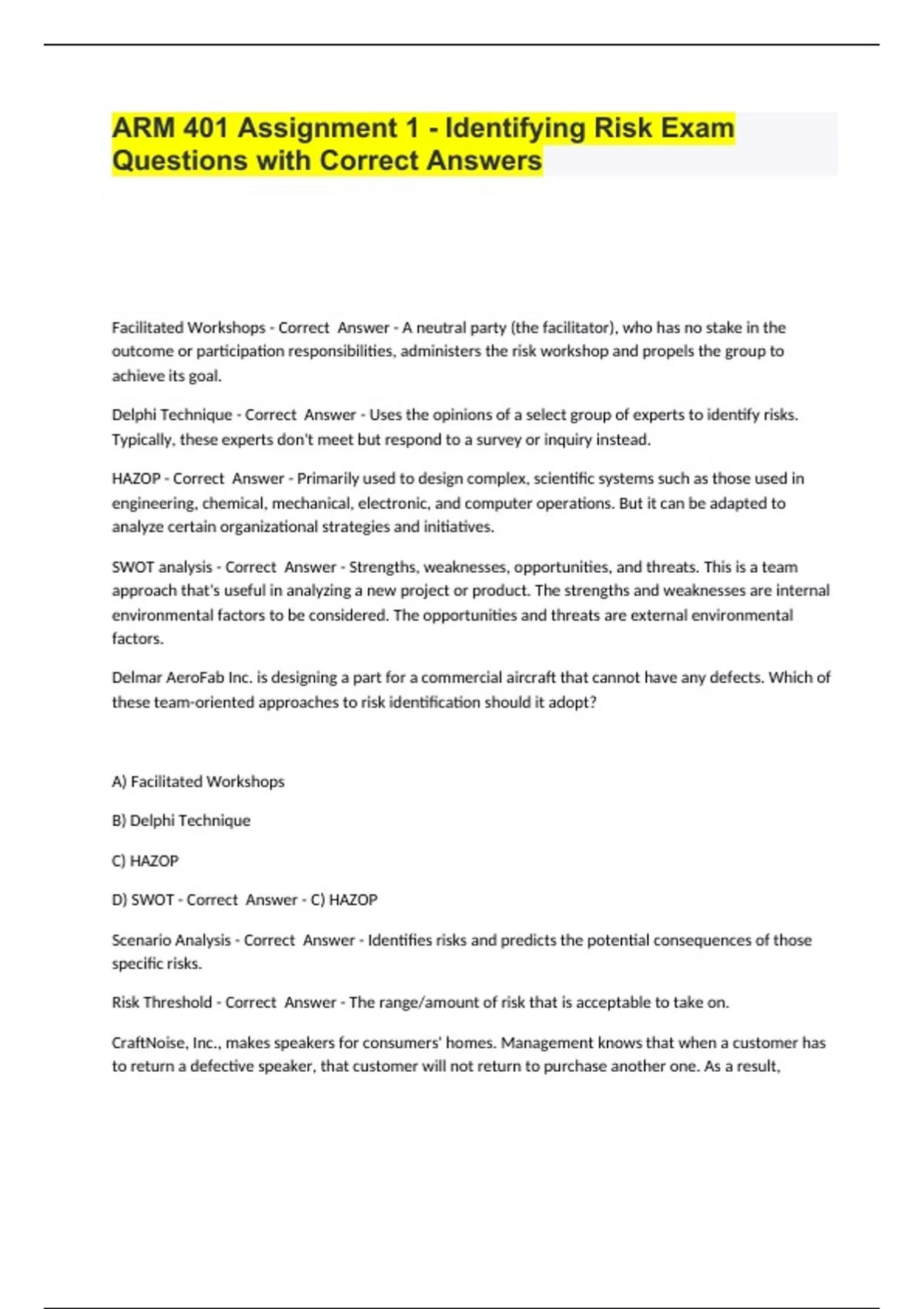 ARM 401 Assignment 1 - Identifying Risk Exam Questions with Correct Answers.