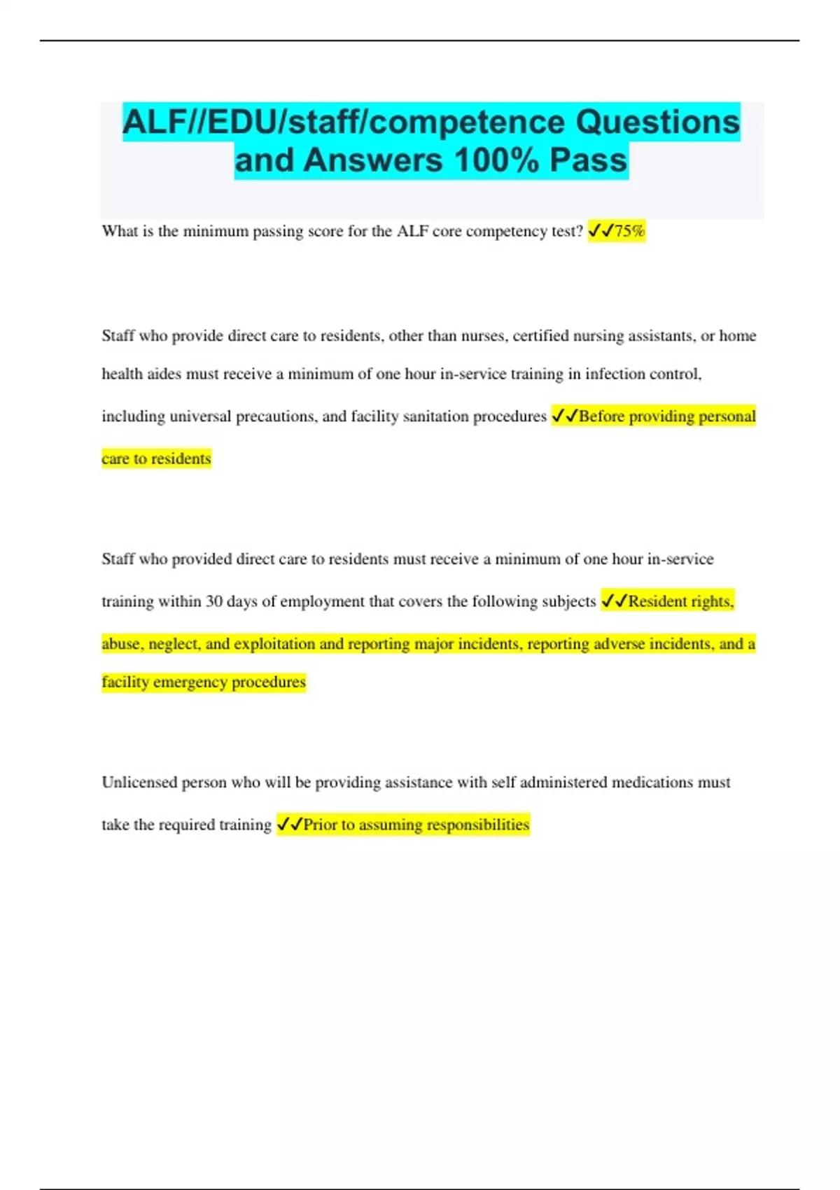 What is the minimum passing score for the ALF core competency test? 75% Staff who provide direct care to residents, other than nurses, certified nursing assistants, or home health aides must receive a minimum of one hour in-service training in infection control, including universal precautions, and facility sanitation procedures Before providing personal care to residents Staff who provided direct care to residents must receive a minimum of one hour in-service training within 30 days of employment that covers the following subjects Resident rights, abuse, neglect, and exploitation and reporting major incidents, reporting adverse incidents, and a facility emergency procedures Unlicensed person who will be providing assistance with self administered medications must take the required training Prior to assuming responsibilities