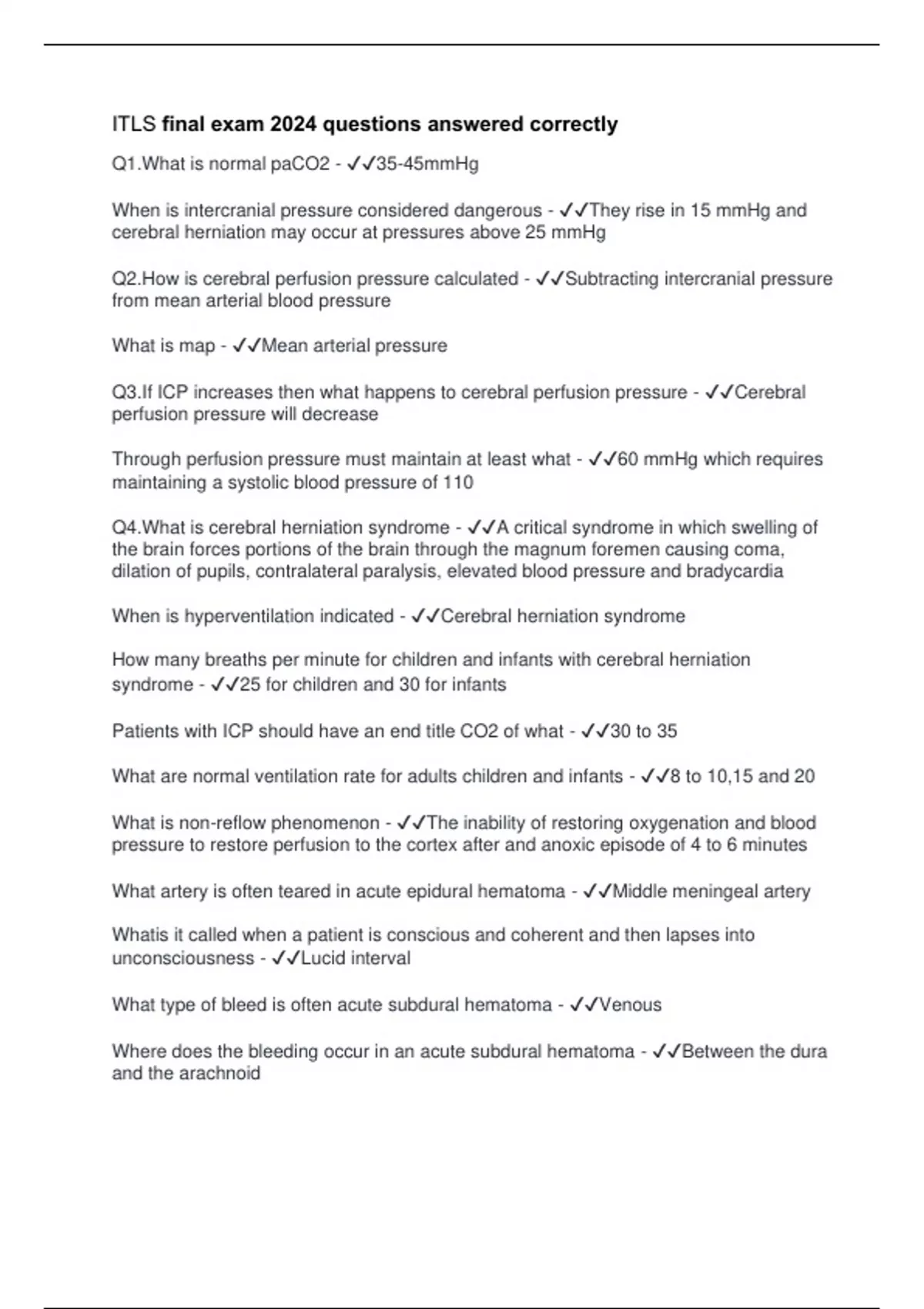 Q1.What is normal paCO2 - 35-45mmHg When is intercranial pressure considered dangerous - They rise in 15 mmHg and cerebral herniation may occur at pressures above 25 mmHg Q2.How is cerebral perfusion pressure calculated - Subtracting intercranial pressure from mean arterial blood pressure What is map - Mean arterial pressure Q3.If ICP increases then what happens to cerebral perfusion pressure - Cerebral perfusion pressure will decrease Through perfusion pressure must maintain at least what - 60 mmHg which requires maintaining a systolic blood pressure of 110 Q4.What is cerebral herniation syndrome - A critical syndrome in which swelling of the brain forces portions of the brain through the magnum foremen causing coma, dilation of pupils, contralateral paralysis, elevated blood pressure and bradycardia
