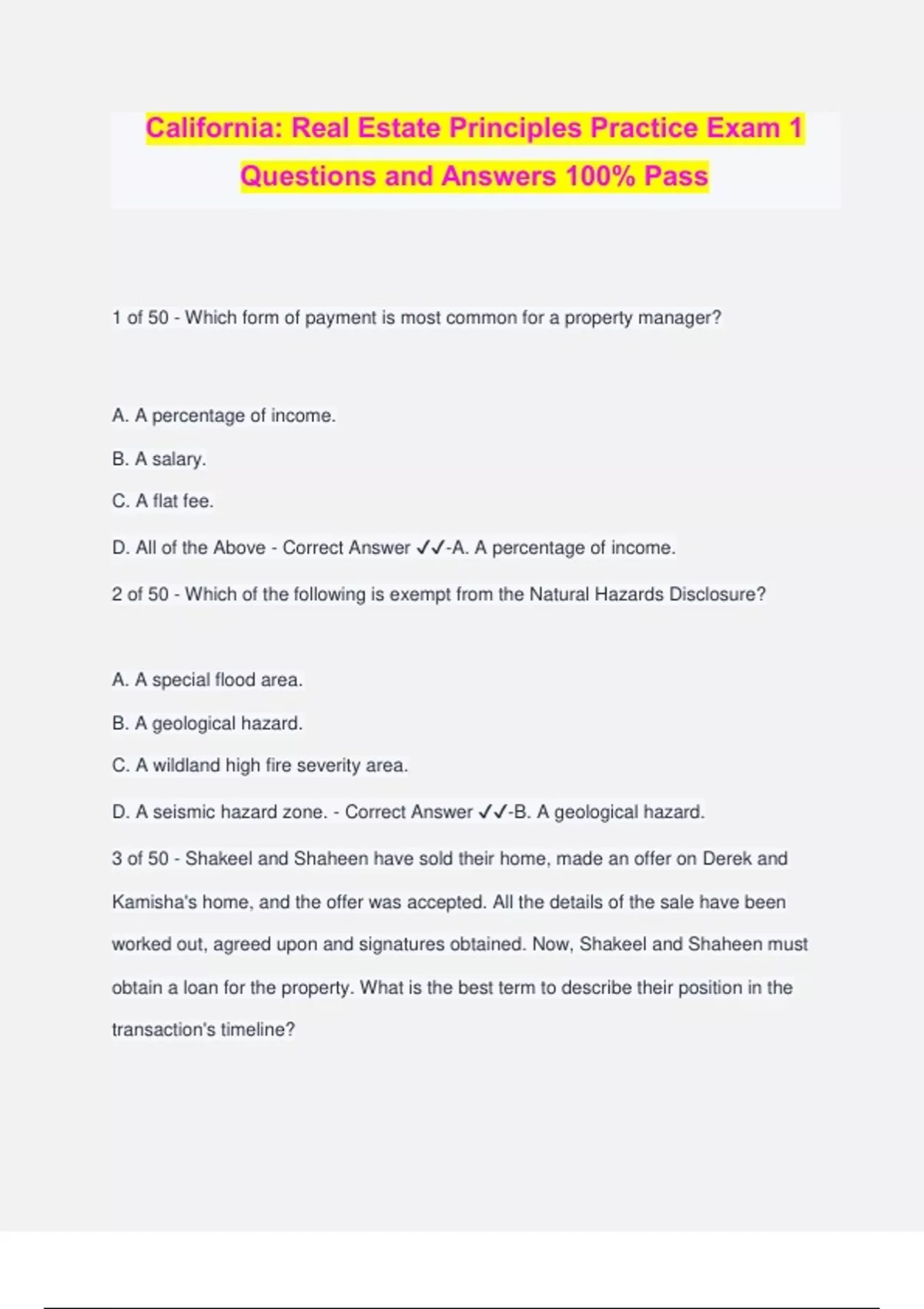 California: Real Estate Principles Practice Exam 1 Questions and Answers 100% Pass 1 of 50 - Which form of payment is most common for a property manager? A. A percentage of income. B. A salary. C. A flat fee. D. All of the Above - Correct Answer ️️ -A. A percentage of income. 2 of 50 - Which of the following is exempt from the Natural Hazards Disclosure? A. A special flood area. B. A geological hazard. C. A wildland high fire severity area. D. A seismic hazard zone. - Correct Answer ️️ -B. A geological hazard. 3 of 50 - Shakeel and Shaheen have sold their home, made an offer on Derek and Kamisha's home, and the offer was accepted. All the details of the sale have been worked out, agreed upon and signatures obtained. Now, Shakeel and Shaheen must obtain a loan for the property. What is the best term to describe their position in the transaction's timeline? A. In Contract B. Chain of Title C. Abstract and Opinion D. Both B and C - Correct Answer ️️ -A. In Contract 4 of 50 - Ted and Lisa are selling their home and have signed a listing agreement. Client or customer? Steven visits Ted and Lisa's open house, and he is interested in purchasing their home. What happens next? Is Steven a client or customer? A. Ted and Lisa are customers, and Steven is a client. The listing agent must disclose to Steven that Ted and Lisa are customers. B. Ted and Lisa are clients, as is Steven. The listing agent must disclose to Steven that Ted and Lisa are also clients. C. Ted and Lisa are customers, and Steven is a client. The listing agent must disclose to Steven that he/she represents Ted and Lisa and explain customer relationships D. Ted and Lisa are clients, and Steven is a customer. The listing agent must disclose to Steven that he/she represents Ted and Lisa and explain customer relationships. - Correct Answer ️️ -D. Ted and Lisa are clients, and Steven is a customer. The listing agent must disclose to Steven that he/she represents Ted and Lisa and explain customer relationships. 5 of 50 - In early common law, transfers of land were only made when: A. The transfer of land from husband to wife, upon the husband's death. B. The transfer of land from father to child, upon the father's death. C. The transfer of land from father to son, upon the father's death. D. Both A and B - Correct Answer ️️ -C. The transfer of land from father to son, upon the father's death. 6 of 50 - What are the parts of a mortgage loan? What purpose does each part serve? A. A Pledge and Collateral. A Pledge is a promise to pay; and Collateral allows a lender the right to foreclose if the borrower does not pay. B. A Promissory Note, a Deed of Trust, and Collateral. A Promissory Note is an I.O.U. to pay; a Deed of Trust secures the interest in a borrower's real property; and Collateral allows a lender the right to foreclose if the borrower does not pay. C. A Pledge and Collateral. A Pledge allows a lender the right to fo