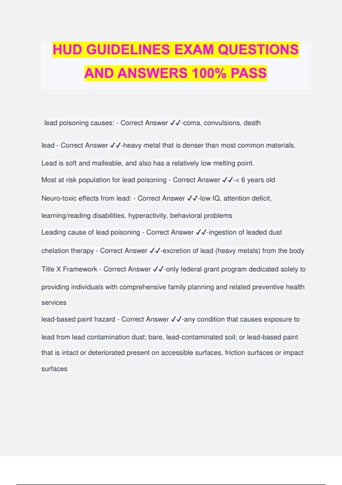 HUD GUIDELINES EXAM QUESTIONS AND ANSWERS 100% PASS lead poisoning causes: - Correct Answer ️️ -coma, convulsions, death lead - Correct Answer ️️ -heavy metal that is denser than most common materials. Lead is soft and malleable, and also has a relatively low melting point. Most at risk population for lead poisoning - Correct Answer ️️ - 6 years old Neuro-toxic effects from lead: - Correct Answer ️️ -low IQ, attention deficit, learning/reading disabilities, hyperactivity, behavioral problems Leading cause of lead poisoning - Correct Answer ️️ -ingestion of leaded dust chelation therapy - Correct Answer ️️ -excretion of lead (heavy metals) from the body Title X Framework - Correct Answer ️️ -only federal grant program dedicated solely to providing individuals with comprehensive family planning and related preventive health services lead-based paint hazard - Correct Answer ️️ -any condition that causes exposure to lead from lead contamination dust; bare, lead-contaminated soil; or lead-based paint that is intact or deteriorated present on accessible surfaces, friction surfaces or impact surfaces paint inspection - Correct Answer ️️ -a surface-by-surface investigation of all painted surfaces using an XRF analyzer of lab analysis, can be performed by eit