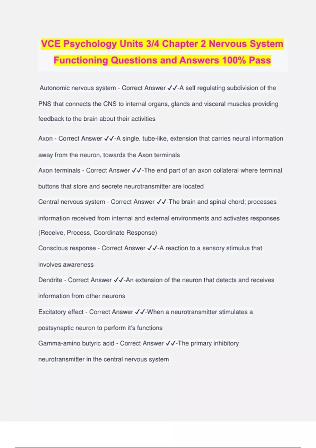 VCE Psychology Units 3/4 Chapter 2 Nervous System Functioning Questions and Answers 100% Pass Autonomic nervous system - Correct Answer ️️ -A self regulating subdivision of the PNS that connects the CNS to internal organs, glands and visceral muscles providing feedback to the brain about their activities Axon - Correct Answer ️️ -A single, tube-like, extension that carries neural information away from the neuron, towards the Axon terminals Axon terminals - Correct Answer ️️ -The end part of an axon collateral where terminal buttons that store and secrete neurotransmitter are located Central nervous system - Correct Answer ️️ -The brain and spinal chord; processes information received from internal and external environments and activates responses (Receive, Process, Coordinate Response) Conscious response - Correct Answer ️️ -A reaction to a sensory stimulus that involves awareness Dendrite - Correct Answer ️️ -An extension of the neuron that detects and receives information from other neurons Excitatory effect - Correct Answer ️️ -When a neurotransmitter stimulates a postsynaptic neuron to perform it's functions
