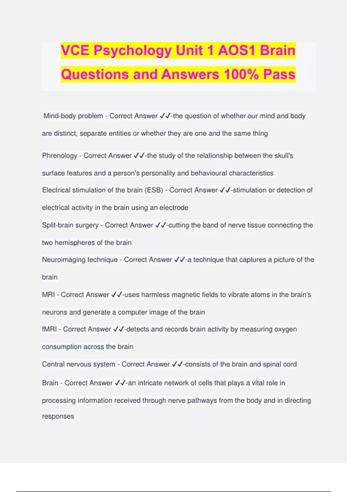 VCE Psychology Unit 1 AOS1 Brain Questions and Answers 100% Pass Mind-body problem - Correct Answer ️️ -the question of whether our mind and body are distinct, separate entities or whether they are one and the same thing Phrenology - Correct Answer ️️ -the study of the relationship between the skull's surface features and a person's personality and behavioural characteristics Electrical stimulation of the brain (ESB) - Correct Answer ️️ -stimulation or detection of electrical activity in the brain using an electrode Split-brain surgery - Correct Answer ️️ -cutting the band of nerve tissue connecting the two hemispheres of the brain Neuroimaging technique - Correct Answer ️️ -a technique that captures a picture of the brain MRI - Correct Answer ️️ -uses harmless magnetic fields to vibrate atoms in the brain's neurons and generate a computer image of the brain fMRI - Correct Answer ️️ -detects and records brain activity by measuring oxygen consumption across the brain Central nervous system - Correct Answer ️️ -consists of the brain and spinal cord Brain - Correct Answer ️️ -an intricate network of cells that plays a vital role in processing information received through nerve pathways from the body and in directing responses Spinal cord - Correct Answer ️️ -the long, thin bu