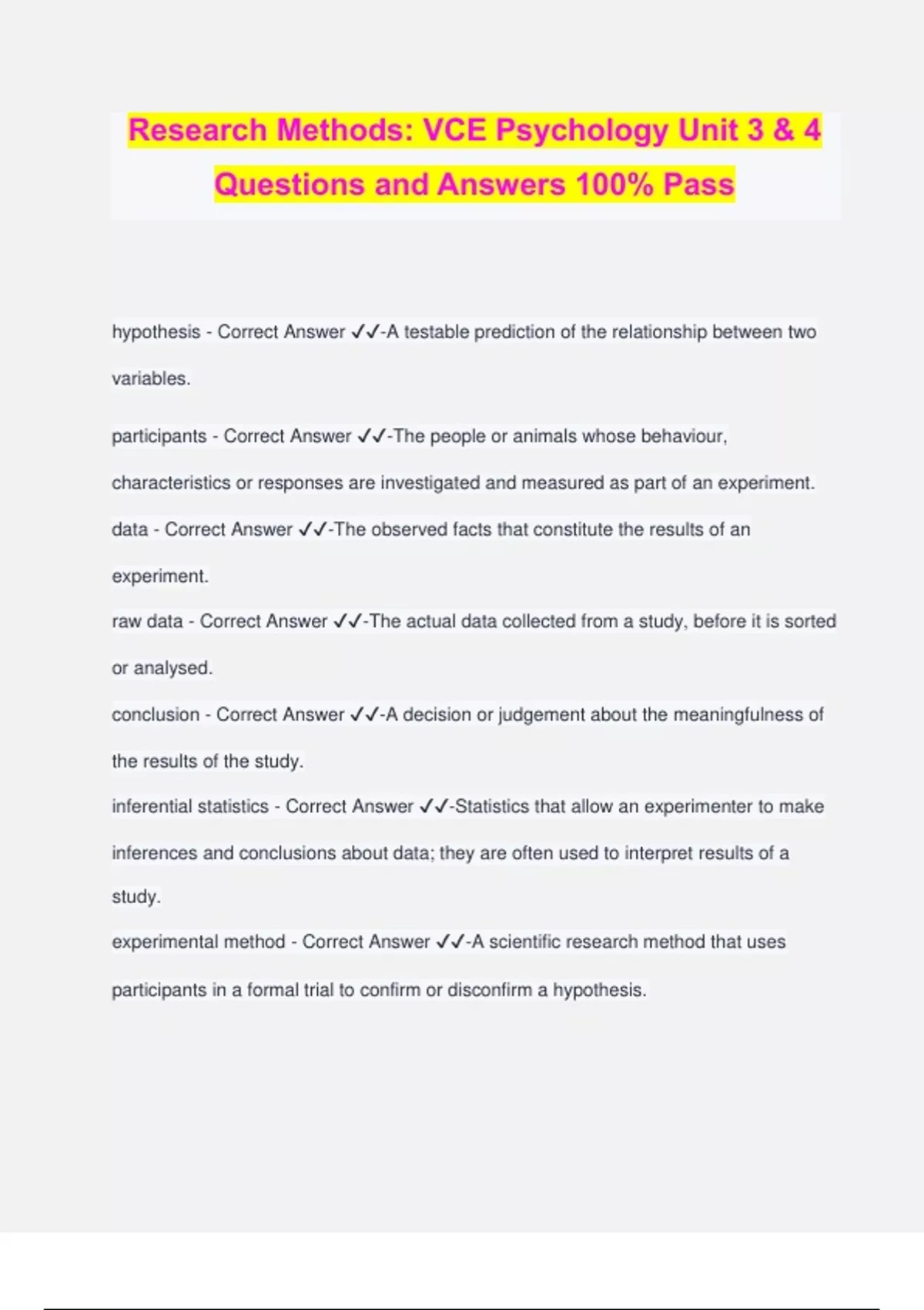 Research Methods: VCE Psychology Unit 3 & 4 Questions and Answers 100% Pass