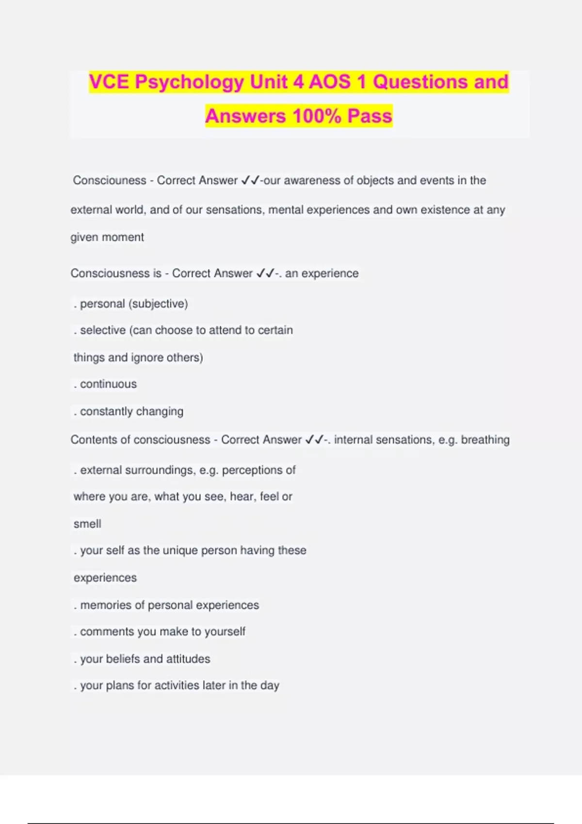 VCE Psychology Unit 4 AOS 1 Questions and Answers 100% Pass Consciouness - Correct Answer ️️ -our awareness of objects and events in the external world, and of our sensations, mental experiences and own existence at any given moment Consciousness is - Correct Answer ️️ -. an experience . personal (subjective) . selective (can choose to attend to certain things and ignore others) . continuous . constantly changing Contents of consciousness - Correct Answer ️️ -. internal sensations, e.g. breathing . external surroundings, e.g. perceptions of where you are, what you see, hear, feel or smell . your self as the unique person having these experiences . memories of personal experiences . comments you make to yourself . your beliefs and attitudes . your plans for activities later in the day Psychological construct - Correct Answer ️️ -a concept that is 'constructed' to describe specific 'psychological' activity, or a pattern of activity, that is believed to occur or exist but cannot be directly observed In studying an individual's state of consciousness, researchers typically rely on - Correct Answer ️️ -. information provided by the individual (e.g. self-reports) . behaviour that is demonstrated (e.g. responses during experimental research) . physiological changes that can be measured (e.g. recording brain activity) Consciousness as a psychological construct - Correct Answer ️️ -cannot be directly observed or measured, thus, it is referred to as a psychological (or hypothetical) construct Consciousness continuum - Correct Answer ️️ -TOTAL AWARENESS . Focused attention . Normal wakefulness DIVISION BETWEEN NORMAL WAKING CONSCIOUSNESS AND ALTERED STATES OF CONSCIOUSNESS . Daydreaming . Meditative state . Hypnotised . Asleep . Anaesthetised . Coma COMPLETE LACK OF AWARENESS Normal Waking Consciousness (NWC) - Correct Answer ️️ -the state