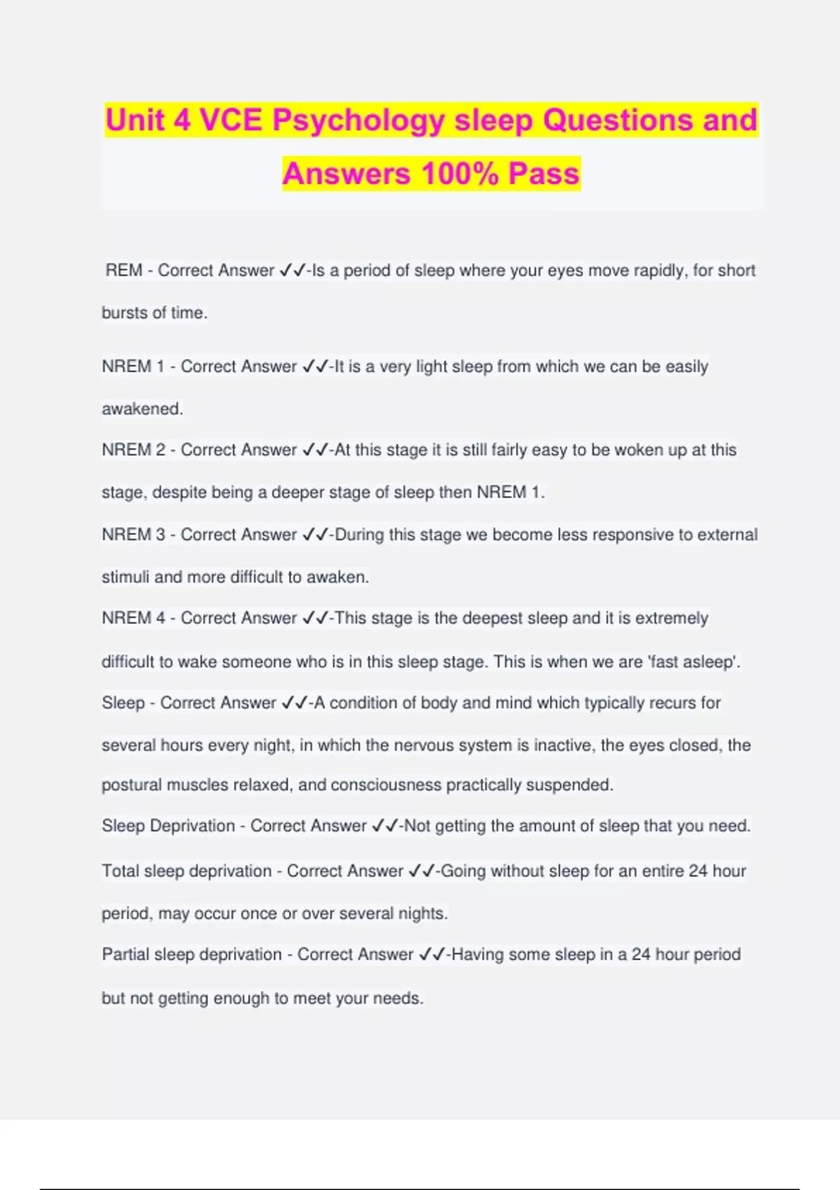 Unit 4 VCE Psychology sleep Questions and Answers 100% Pass REM - Correct Answer ✔️✔️-Is a period of sleep where your eyes move rapidly, for short bursts of time. NREM 1 - Correct Answer ✔️✔️-It is a very light sleep from which we can be easily awakened. NREM 2 - Correct Answer ✔️✔️-At this stage it is still fairly easy to be woken up at this stage, despite being a deeper stage of sleep then NREM 1. NREM 3 - Correct Answer ✔️✔️-During this stage we become less responsive to external stimuli and more difficult to awaken. NREM 4 - Correct An swer ✔️✔️-This stage is the deepest sleep and it is extremely difficult to wake someone who is in this sleep stage. This is when we are 'fast asleep'. Sleep - Correct Answer ✔️✔️-A condition of body and mind which typically recurs for several hours every n ight, in which the nervous system is inactive, the eyes closed, the postural muscles relaxed, and consciousness practically suspended. Sleep Deprivation - Correct Answer ✔️✔️-Not getting the amount of sleep that you need. Total sleep deprivation - Correct Answer ✔️✔️-Going without sleep for an entire 24 hour period, may occur once or over several nights. Partial sleep deprivation - Correct Answer ✔️✔️-Having some sleep in a 24 hour period but not getting enough to meet your needs.