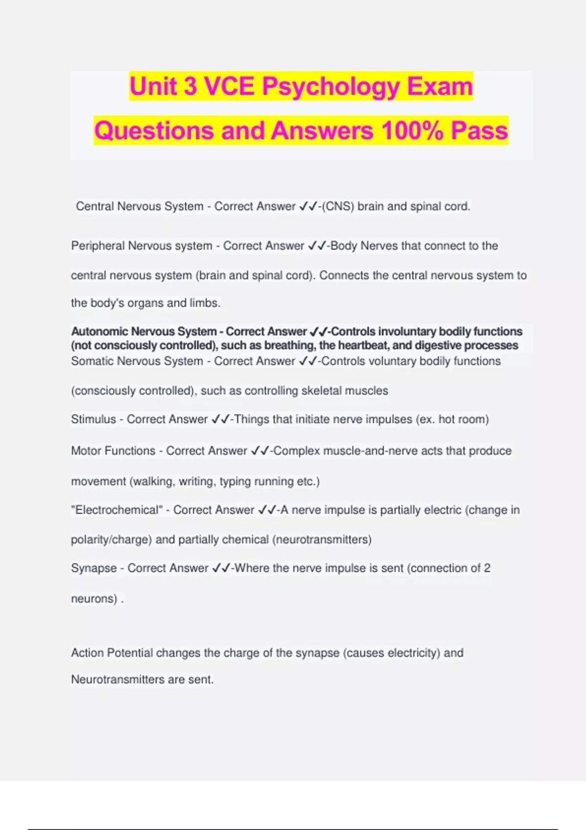 Unit 3 VCE Psychology Exam Questions and Answers 100% Pass Central Nervous System - Correct Answer ️️ -(CNS) brain and spinal cord. Peripheral Nervous system - Correct Answer ️️ -Body Nerves that connect to the central nervous system (brain and spinal cord). Connects the central nervous system to the body's organs and limbs. Autonomic Nervous System - Correct Answer ️️ -Controls involuntary bodily functions (not consciously controlled), such as breathing, the heartbeat, and digestive processes Somatic Nervous System - Correct Answer ️️ -Controls voluntary bodily functions (consciously controlled), such as controlling skeletal muscles Stimulus - Correct Answer ️️ -Things that initiate nerve impulses (ex. hot room) Motor Functions - Correct Answer ️️ -Complex muscle-and-nerve acts that produce movement (walking, writing, typing running etc.) "Electrochemical" - Correct Answer ️️ -A nerve impulse is partially electric (change in polarity/charge) and partially chemical (neurotransmitters) Synapse - Correct Answer ️️ -Where the nerve impulse is sent (connection of 2 neurons) . Action Potential changes the charge of the synapse (causes electricity) and Neurotransmitters are sent. Myelin Sheath - Correct Answer ️️ -Offers protection to the neuron, Speeds up nerve impulses. Axon - Correct Answer ️️ -The long threadlike part of a nerve cell that carry the nerve impulse Dendrites - Correct Answer ️️ -Branch like extensions on a neuron that GET signals and connect to the synapse Neurotransmitters - Correct Answer ️️ -Chemicals that transmit signals across a synapse from one neuron to another 'target' neuron Sensory Neuron - Correct Answer ️️ -Nerve cells that transmit sensory information (sight, smell, sound etc.) Interneuron - Correct Answer ️️ -Nerve cells that connect motor ne