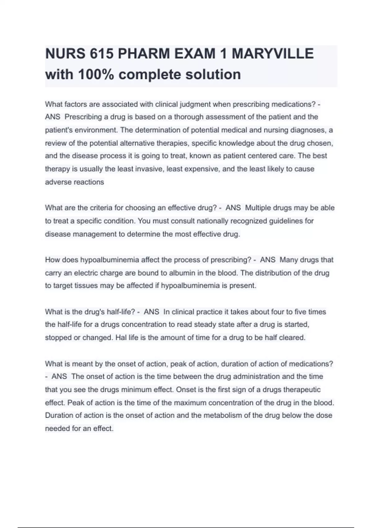 NURS 615 PHARM EXAM 1 MARYVILLE with 100% complete solution